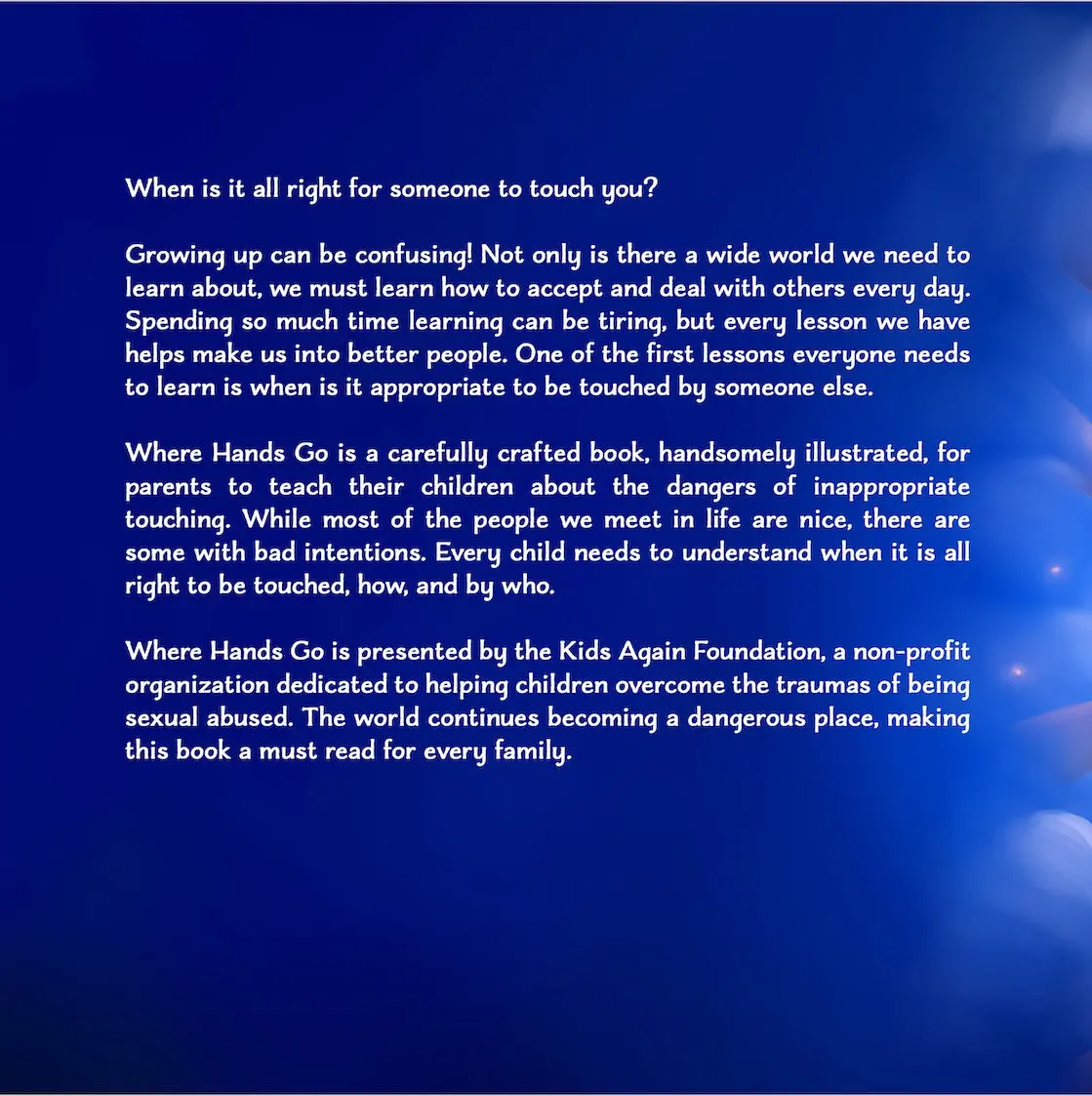 This book is a good introduction into the conversation of inappropriate touching I love the poem that’s in the inside about inappropriate touching that the mom made up and the details at the end of the book for suggestions on how to talk to your kid about inappropriate touching