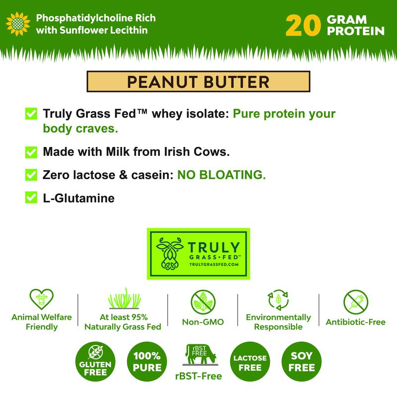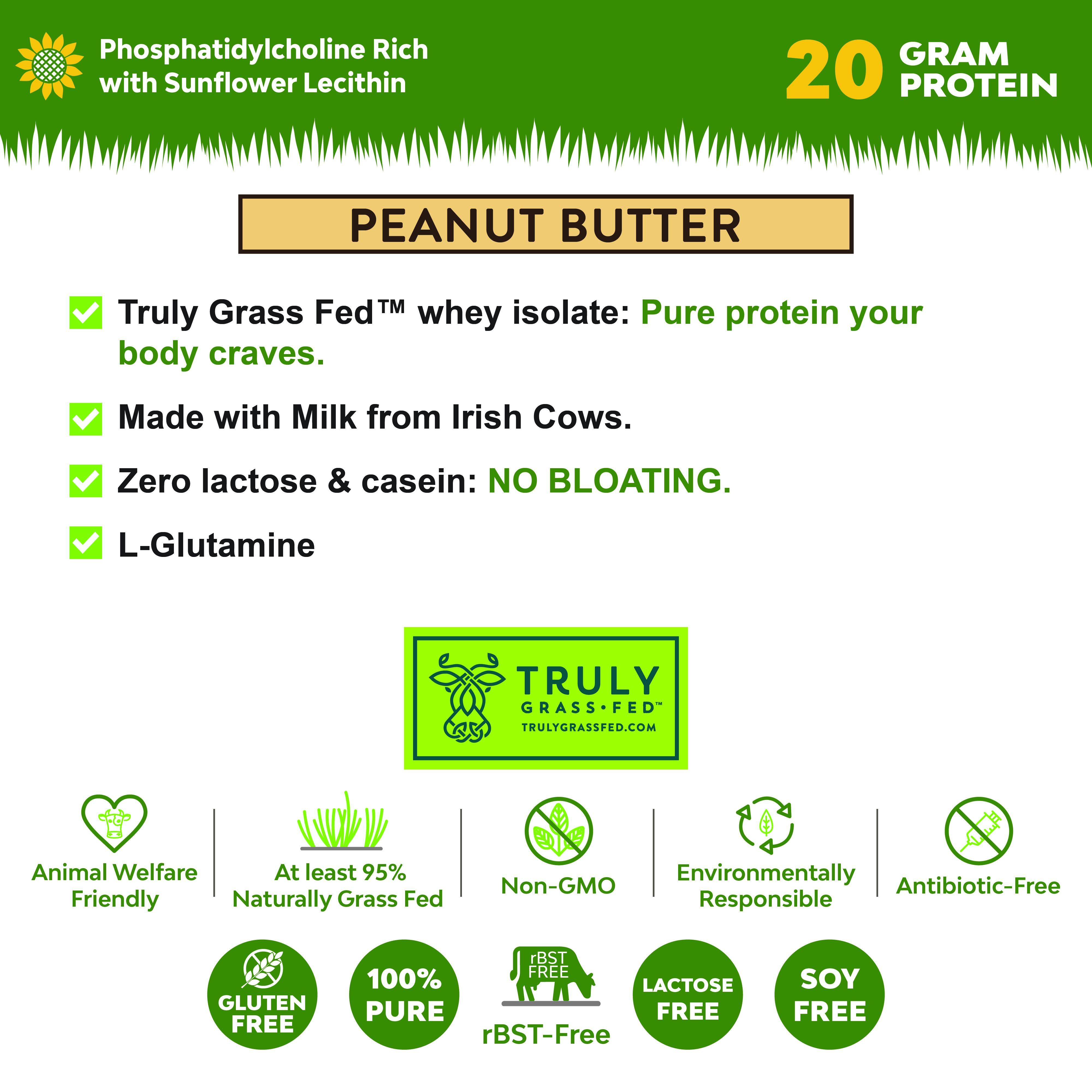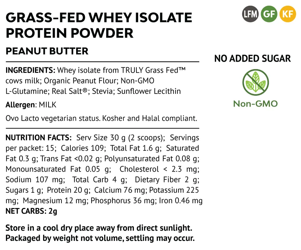 INGREDIENTS: Whey isolate from TRULY Grass Fed cows milk; Organic Peanut Flour; Non-GMO L-Glutamine; Real Salt; Stevia; Sunflower Lecithin