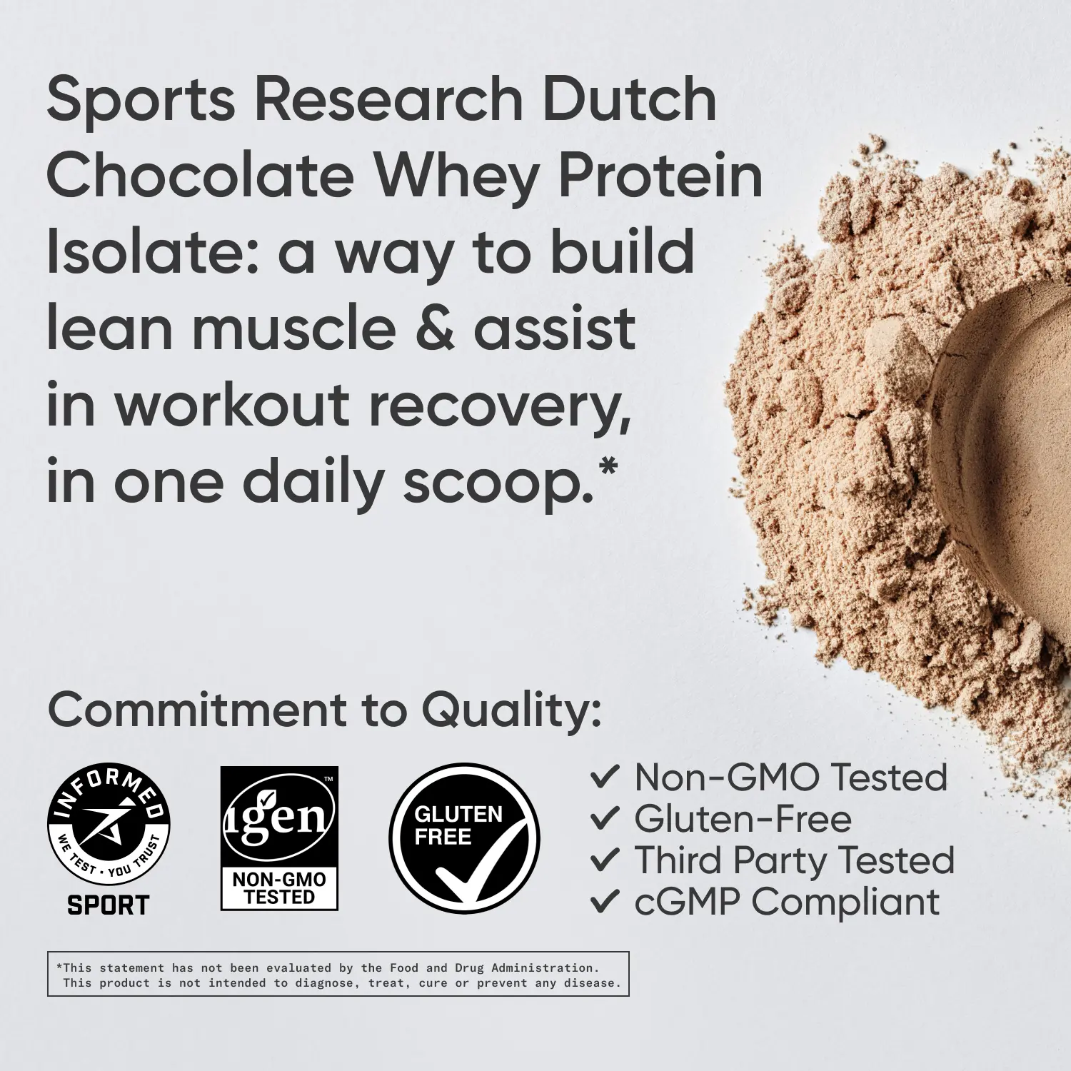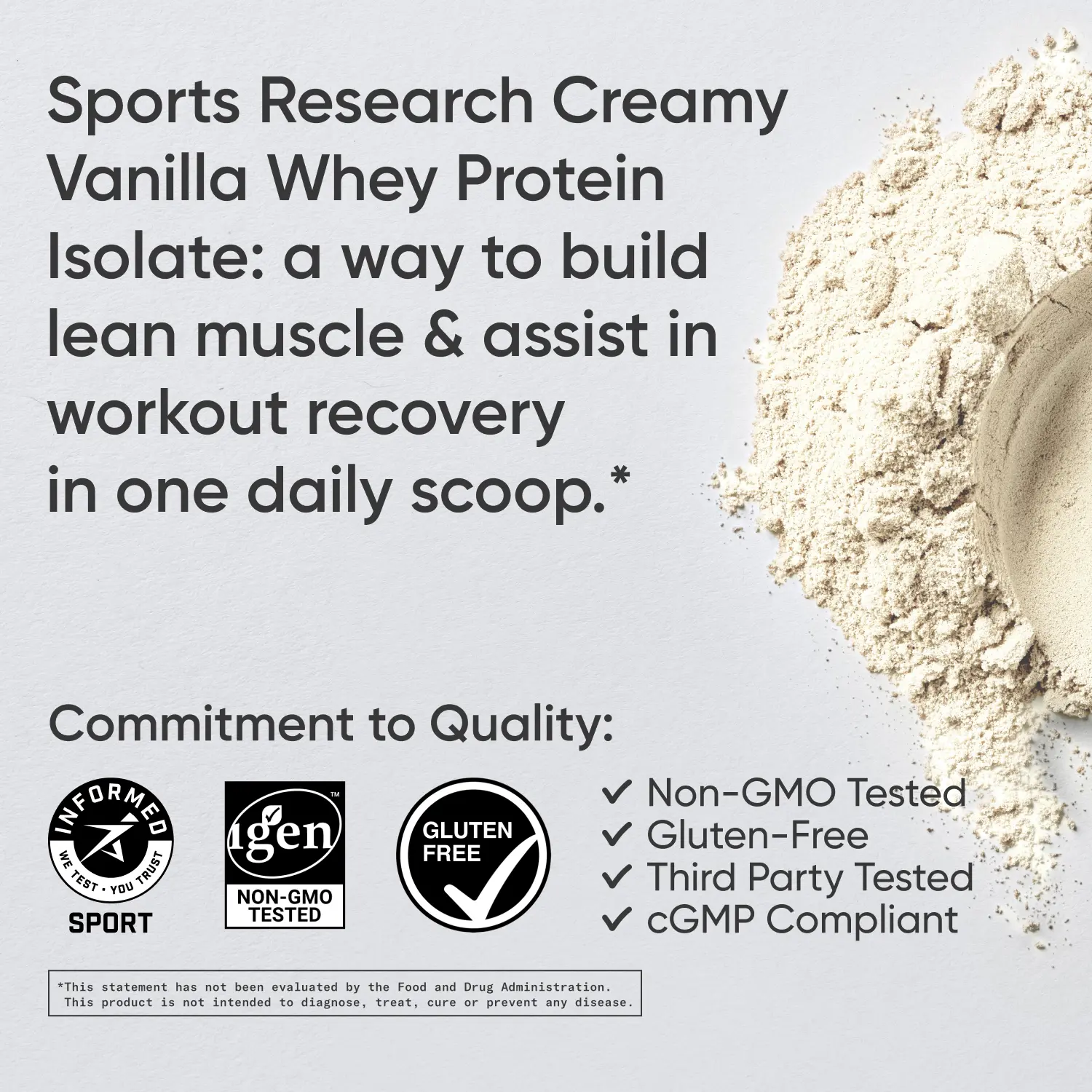 Enhance any workout, routine, or recipe with Sports Research Whey Protein Powder. Sourced in the U.S., each scoop of protein powder contains 25g of protein and 6.9g of BCAAs. Our post-workout protein powder with Vitamin D and MCTs delivers your vital proteins with increased benefit potential. You can shake, blend, and bake your way to results with our instantized formula, created for easy mixing and to prevent clumping, making it a perfect protein shake powder, smoothie protein powder, protein for baking, and a protein coffee creamer. Our protein powder contains only 150 calories and less than 1g of sugar per serving, so you can get a protein boost while experiencing the benefits of prioritizing your health. For all Sports Research supplements, we only sign off on top-quality ingredients, so you can rest assured that you’re consuming a whey protein powder isolate that is gluten-free, soy-free, cGMP compliant and IGEN non-GMO verified. Our isolated whey protein powder is certified with the Informed Sports Seal, guaranteed to be free of banned substances for your peace of mind.