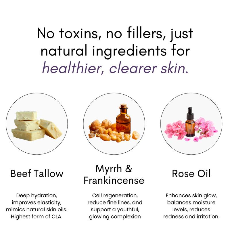 Unlock radiant, healthy skin with our premium Grass-Fed Tallow Face Cream, handcrafted in small batches from 100% natural, nutrient-rich ingredients. Our deeply moisturizing formula harnesses the ancient wisdom of using beef tallow—specifically kidney suet—to restore your skin's natural glow.