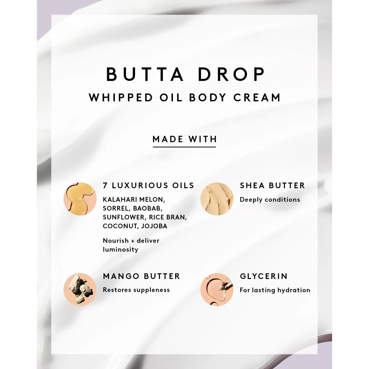 A thick, rich, luxed-up body moisturizer that buttas you up in nourishing hydration that lasts. Dip into this whipped oil cream loaded with nearly 25% rich butters, restorative tropical oils and extracts.