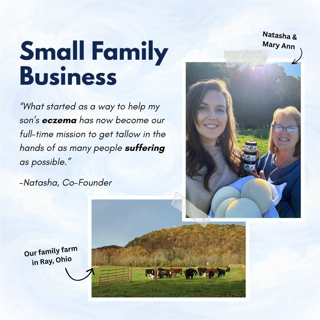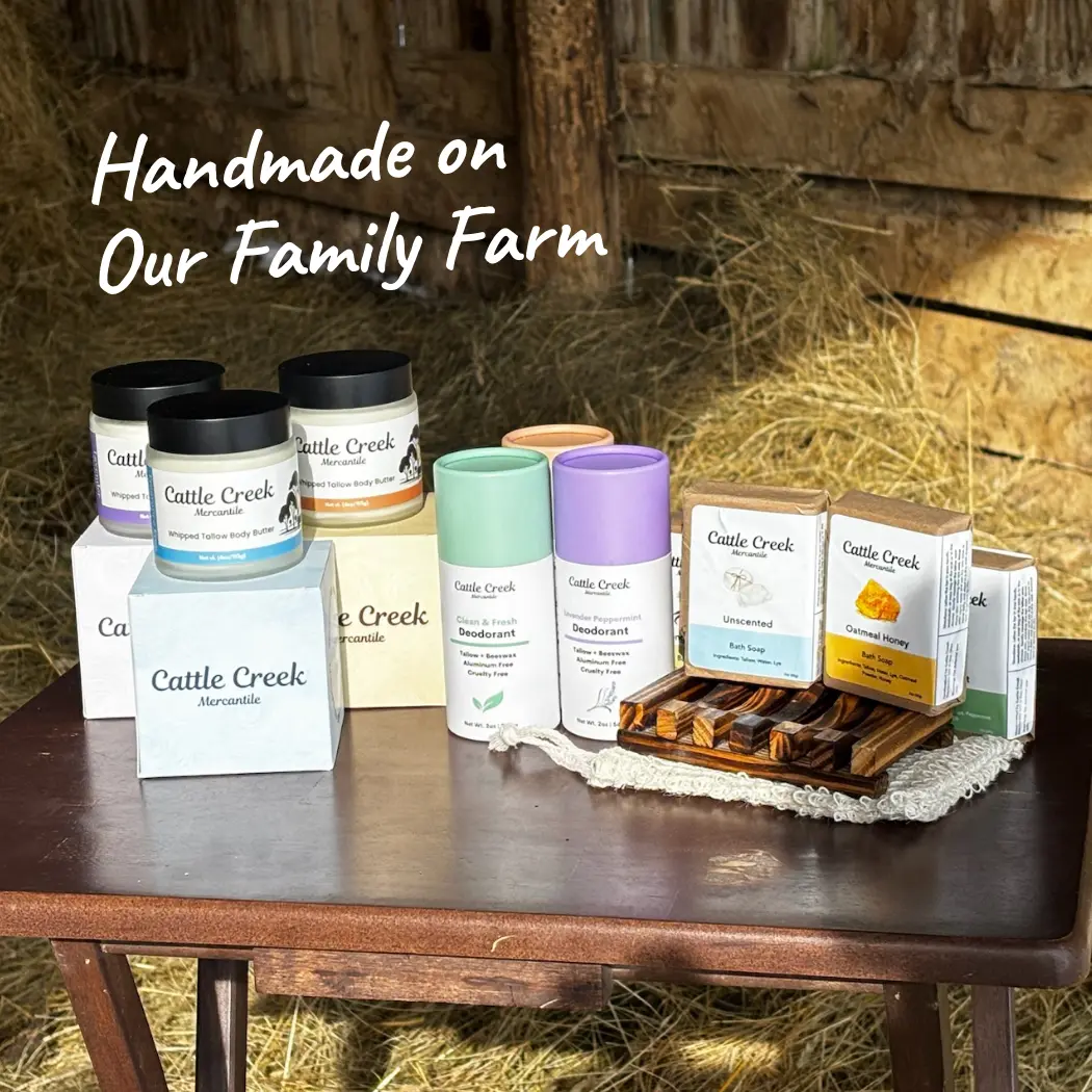 At Cattle Creek Mercantile, everything began on our family farm in Ray, Ohio. When our young son’s eczema was so severe that every lotion and prescription failed him, we turned to tallow from our own grass-fed cows. Overnight, his skin began to heal. That moment showed us the power of this simple ingredient and inspired us to share it with others who need relief.