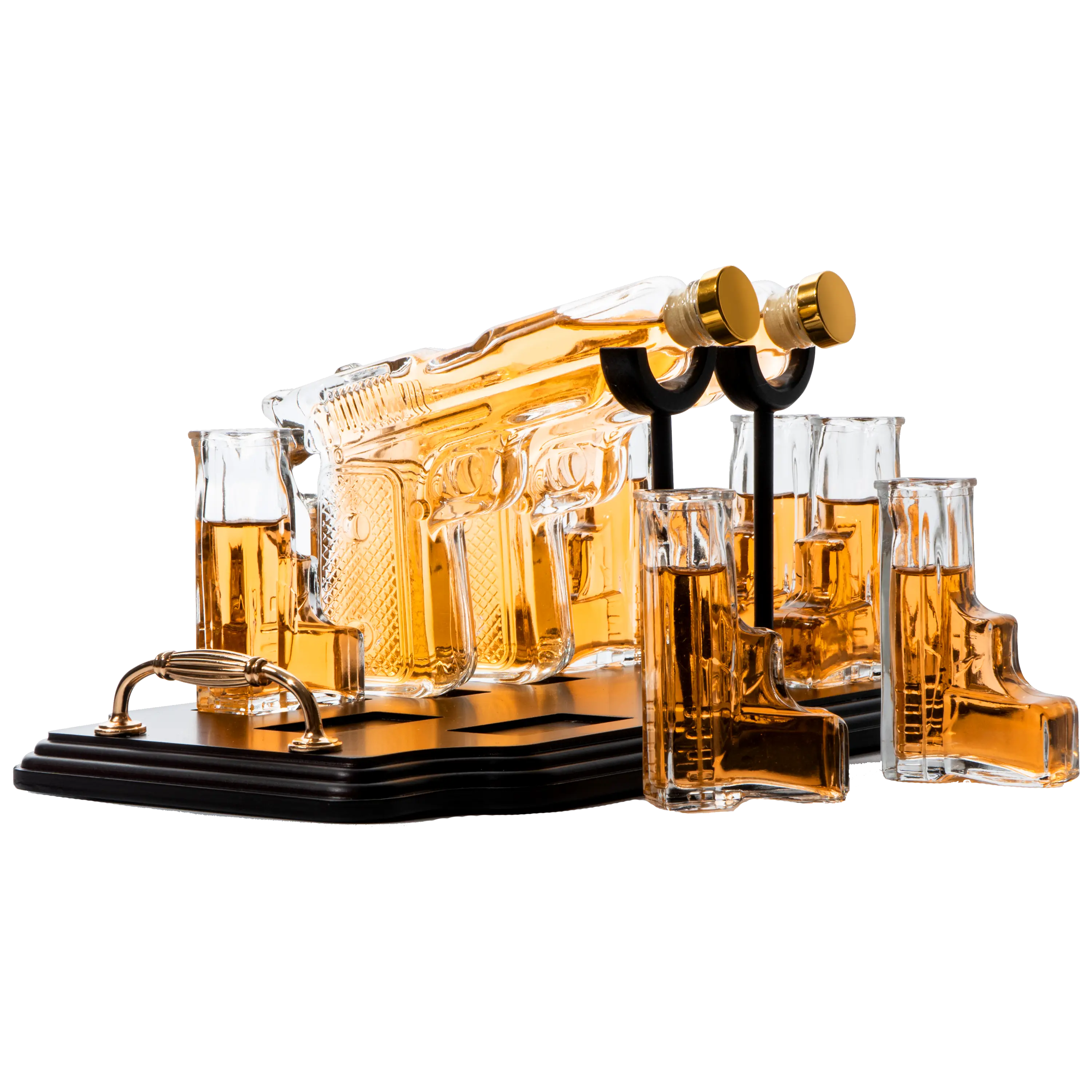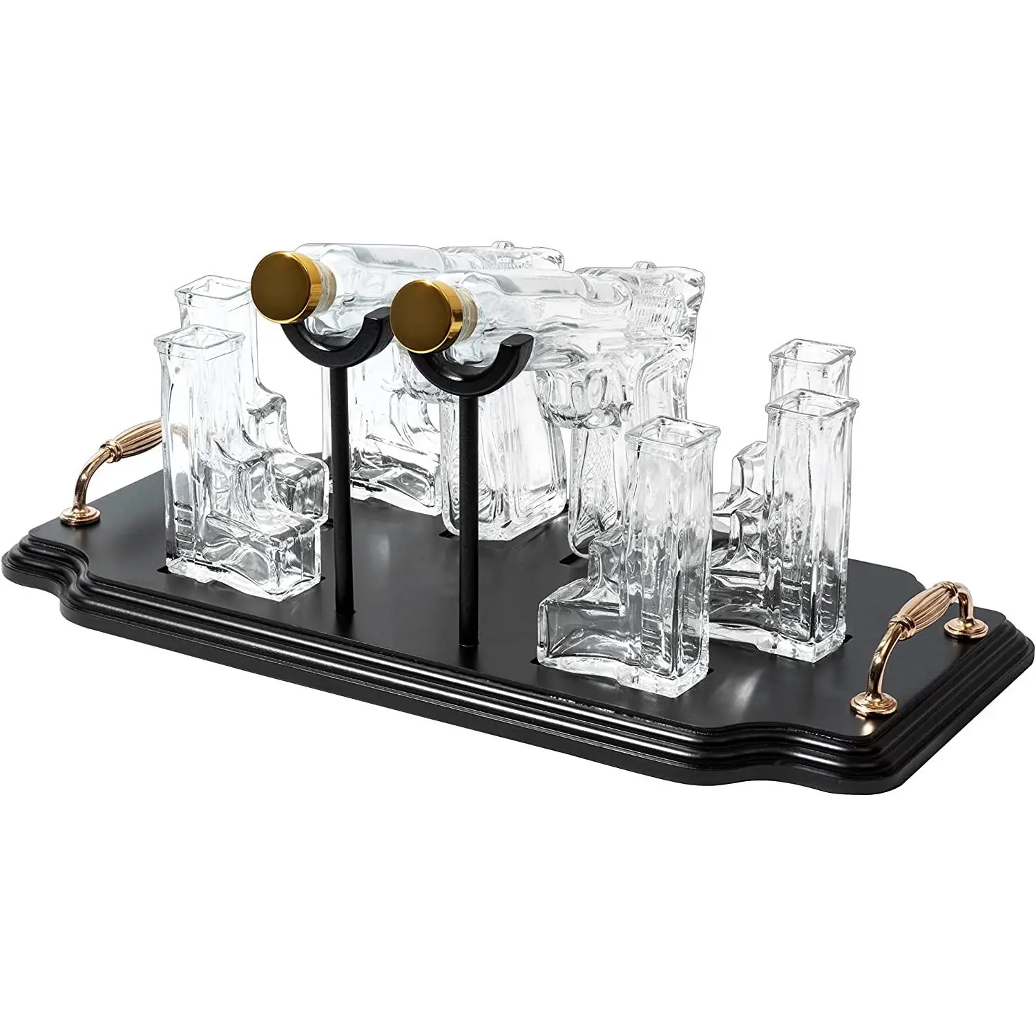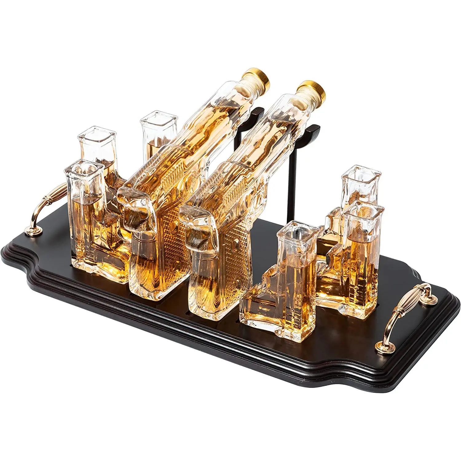 ·Shock your guests with this double Pistol Gun Decanter & 6 Shot Glasses Set paired with a wooden display stand. Can you imagine how classy this will look in your bar? This elegant gun shaped wine, whiskey or spirits decanter pistols are paired with a wooden display stand that makes it a classic piece in any home bar. The base of the stand holds six shot glasses that are included. Perfect gifts for men and women members of law enforcement, military, police officers!