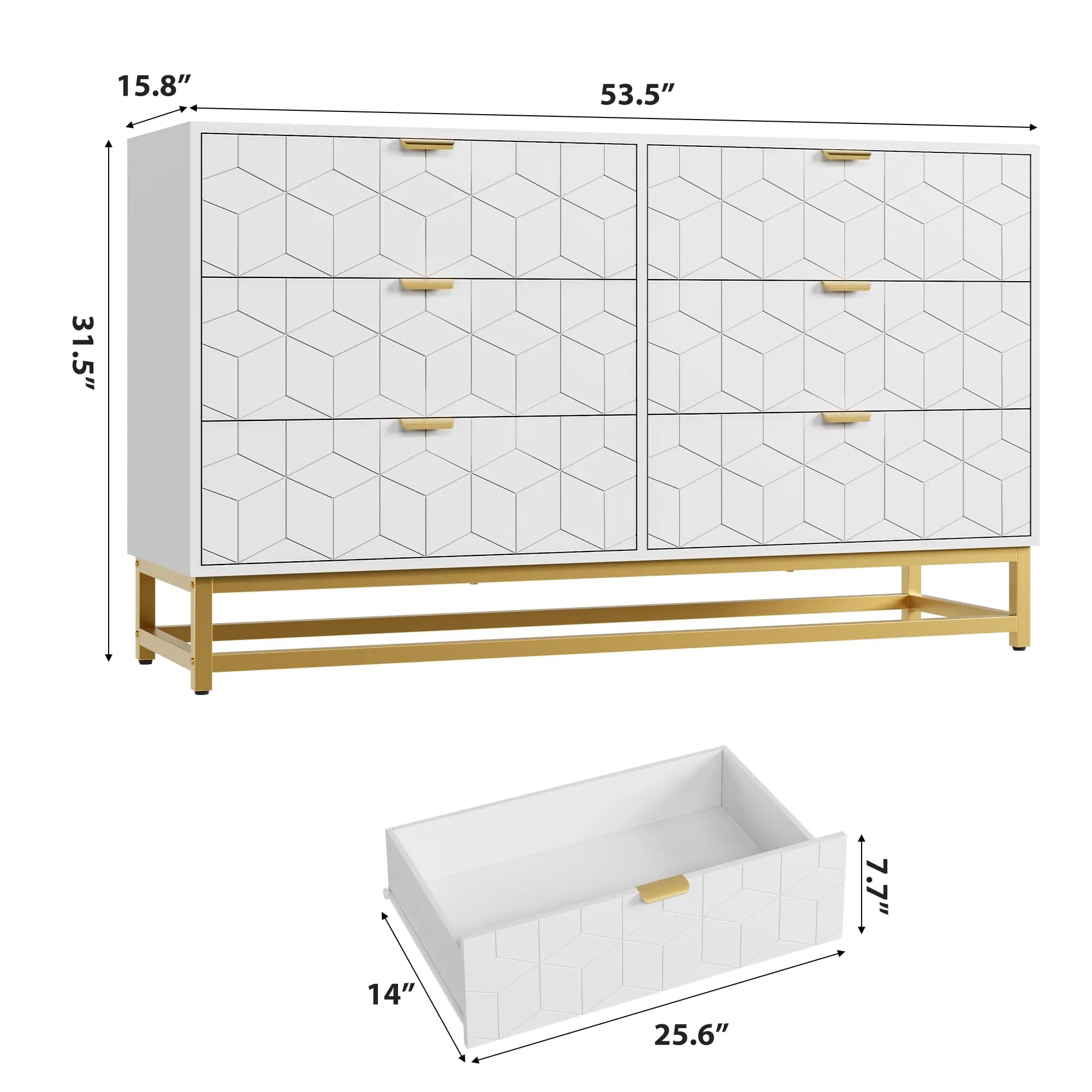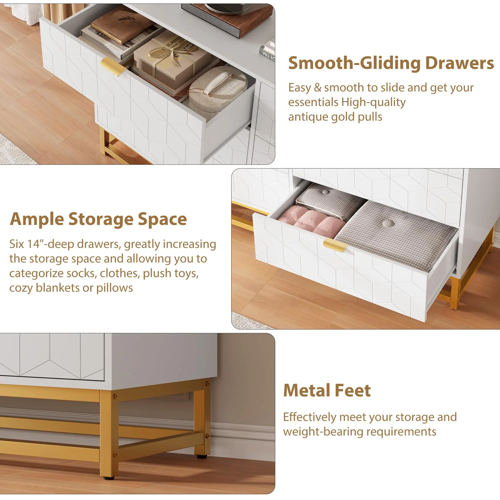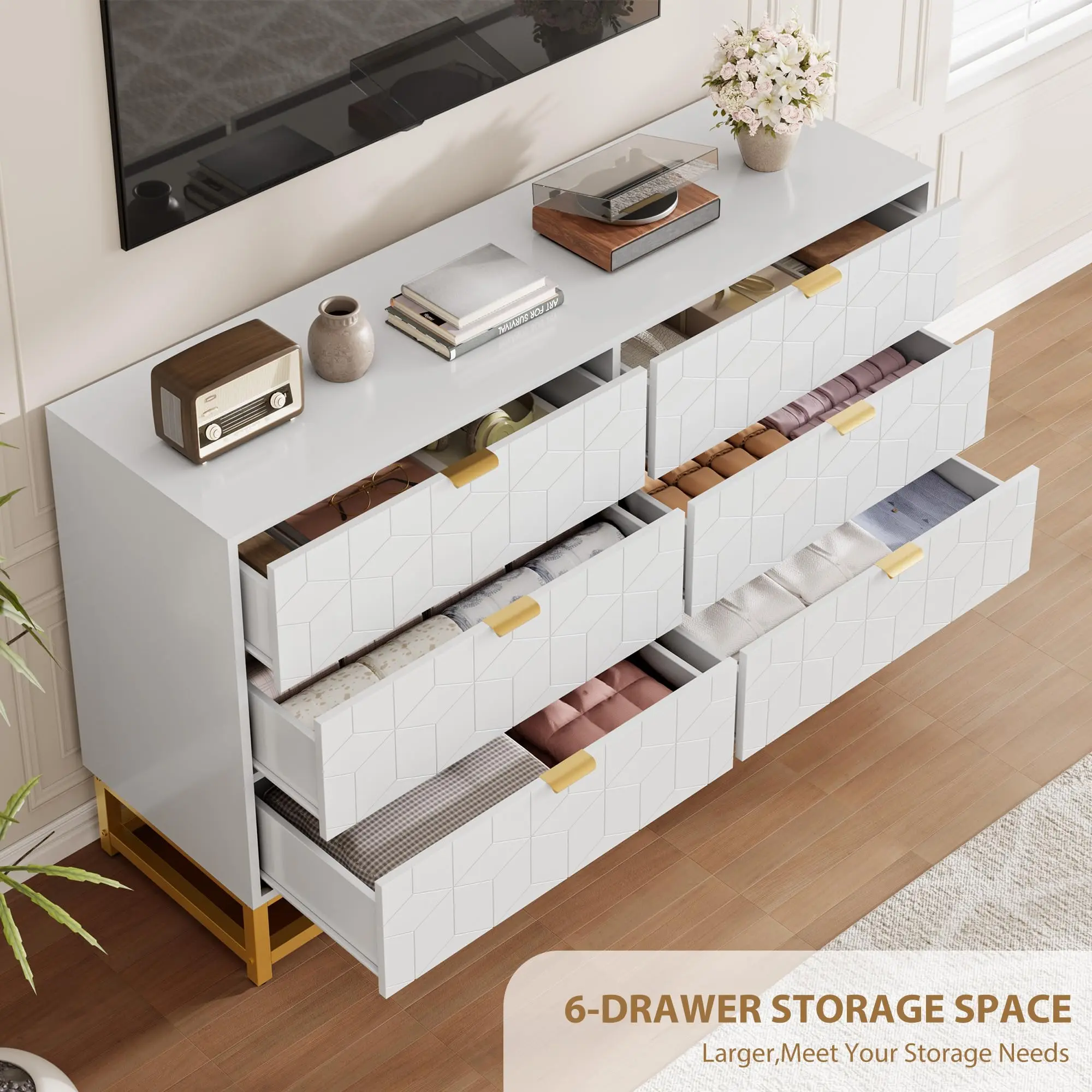 [Modern and Charming] The exquisite gold metal legs and handles, paired with modern carved patterns, infuse this white dresser with an artistic flair. This design effortlessly complements a range of decorative styles, bringing a unique charm to your space.