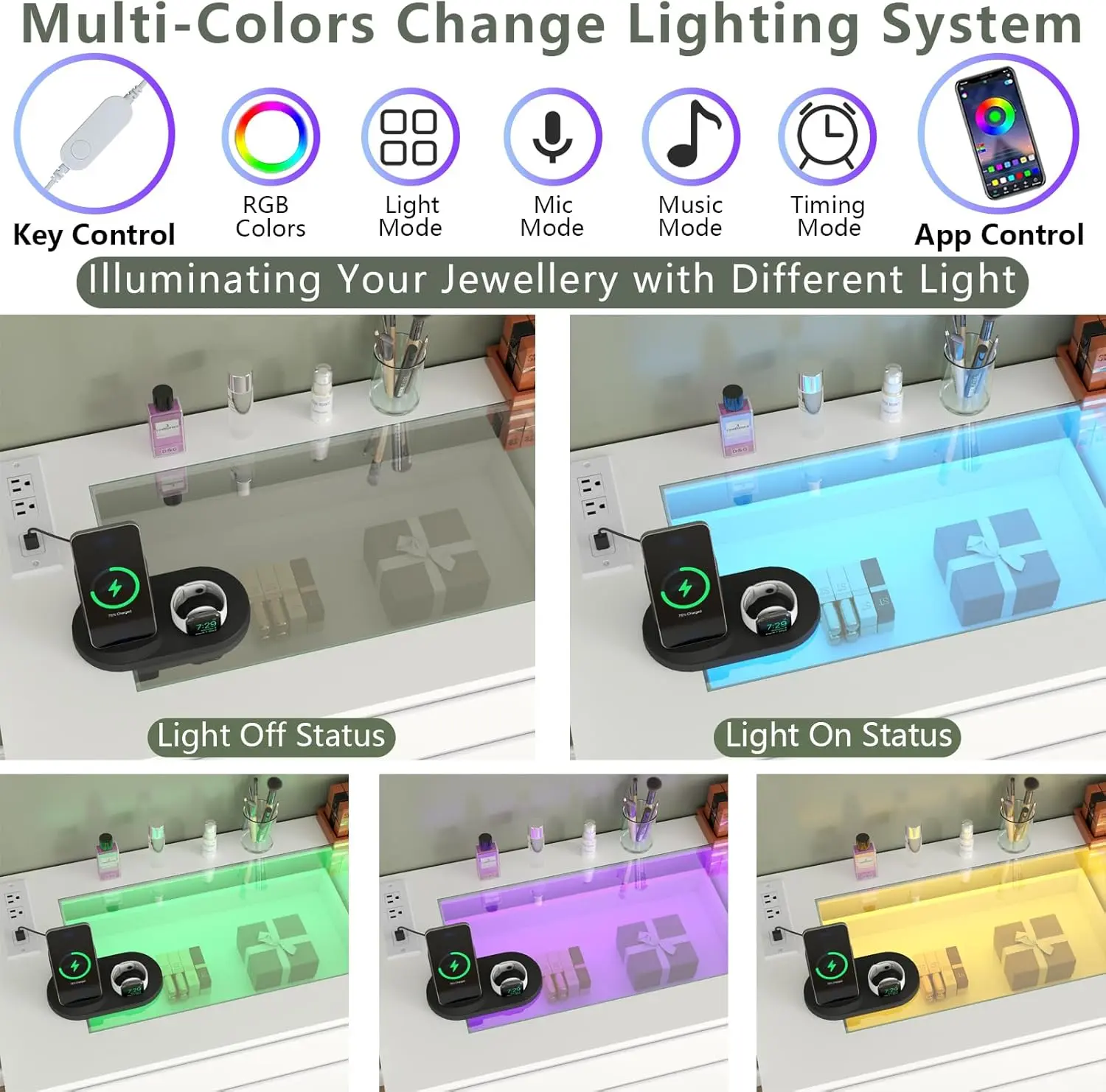 ·The top of white dresser is tempered glass, which provides a smooth, reflective surface that can be used to display decorative also pretty visibility. Combine with LED light in the first level drawer, which makes it more convenient for you to display and access your jewellery or makeup collection. Making the dresser a standout piece in any room.