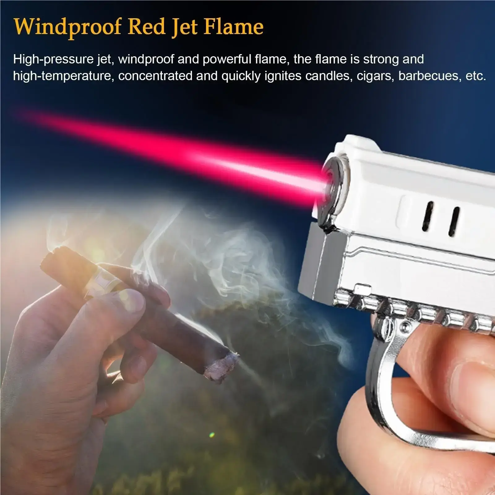 Meet your new go-to fire-starting essentials: the Collapsible windproof adjustable jet flame lighter In sleek white! Designed for both home cooks and outdoor adventurers, this lighter lets you tweak the flame size with a simple twist - going from a subtle flame for lighting stovetops or candles in the kitchen to a powerful jet flame that cuts through wind on camping trips or grill nights. Its foldable, compact build slides right into your pocket, backpack, or grilled caddy - no bulky gear to weigh you down. The windproof design ensures your flame stays steady even in gusty conditions, so you'll never waste time fumbling with flimsy matches or lighters that die out mid-use. Critical Shipping Notes: This lighter ships Without gas To comply with TikTok and shipping safety regulations. Just fill it with butane gas (not included) and it's ready to tackle any fire-starting task! Whether you're searing burgers on the grill, igniting a campfire for your next outdoor adventure, or lighting a stove for weeknight dinners, this white adjustable jet flame lighter blends functionality with a clean, minimalist look. Don't let wind or small flames slow you down - grab yours today and make every fire-starting moment quick and easy!