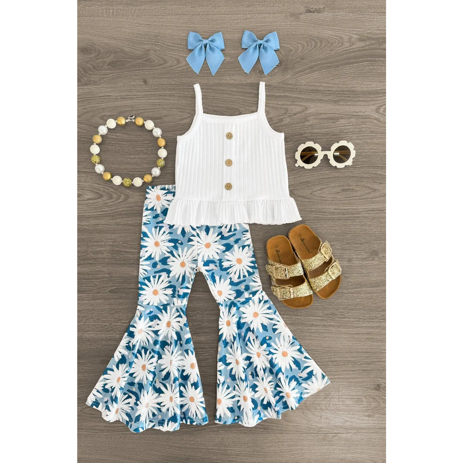 Add sweet fluttery style to her look with this White & Blue Daisy Bell Bottom Set. This girls' set is styled with an adorable white peplum tank top, making it a staple addition to her warm weather wear. The top looks adorable paired with the matching daisy floral bell bottoms. The stretchy waistband provides a secure fit, while the flare design adds a fun touch. She can pair this set with sandals or our fun bows for the perfect look!