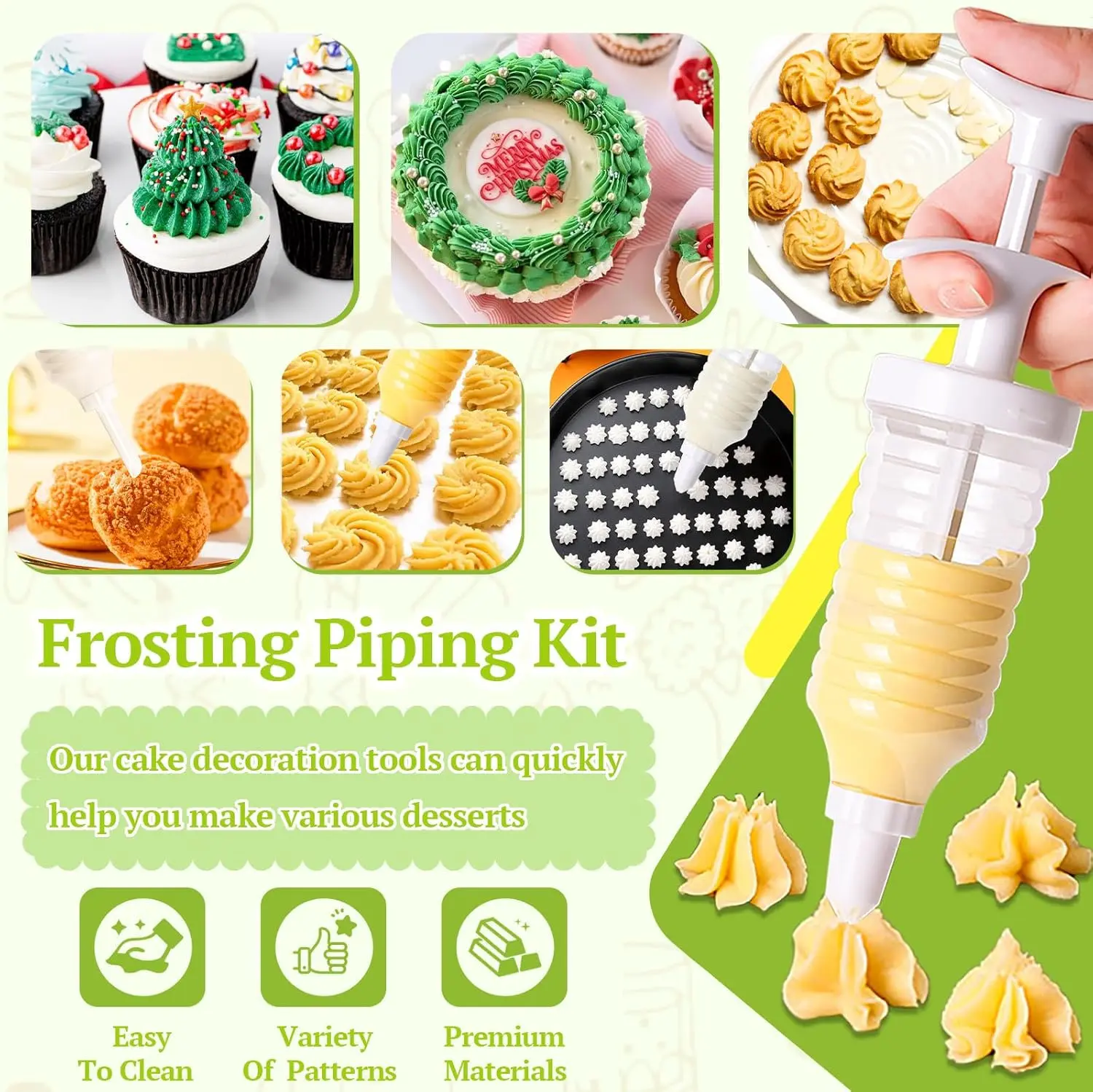 ·【High Quality】The cake decorating kit(cake decorating gun and piping tips) is made of high-quality plastic, smooth and safe to use.