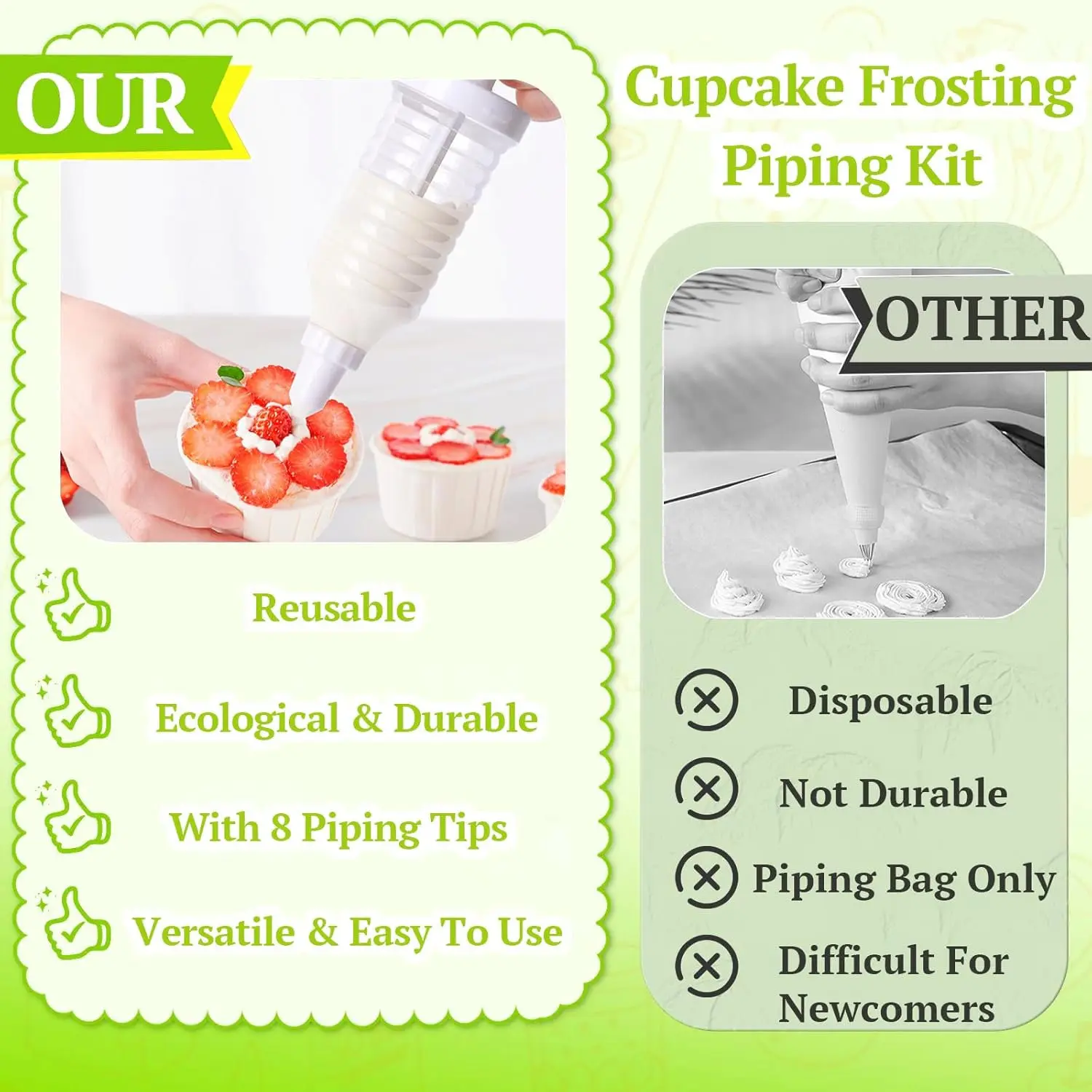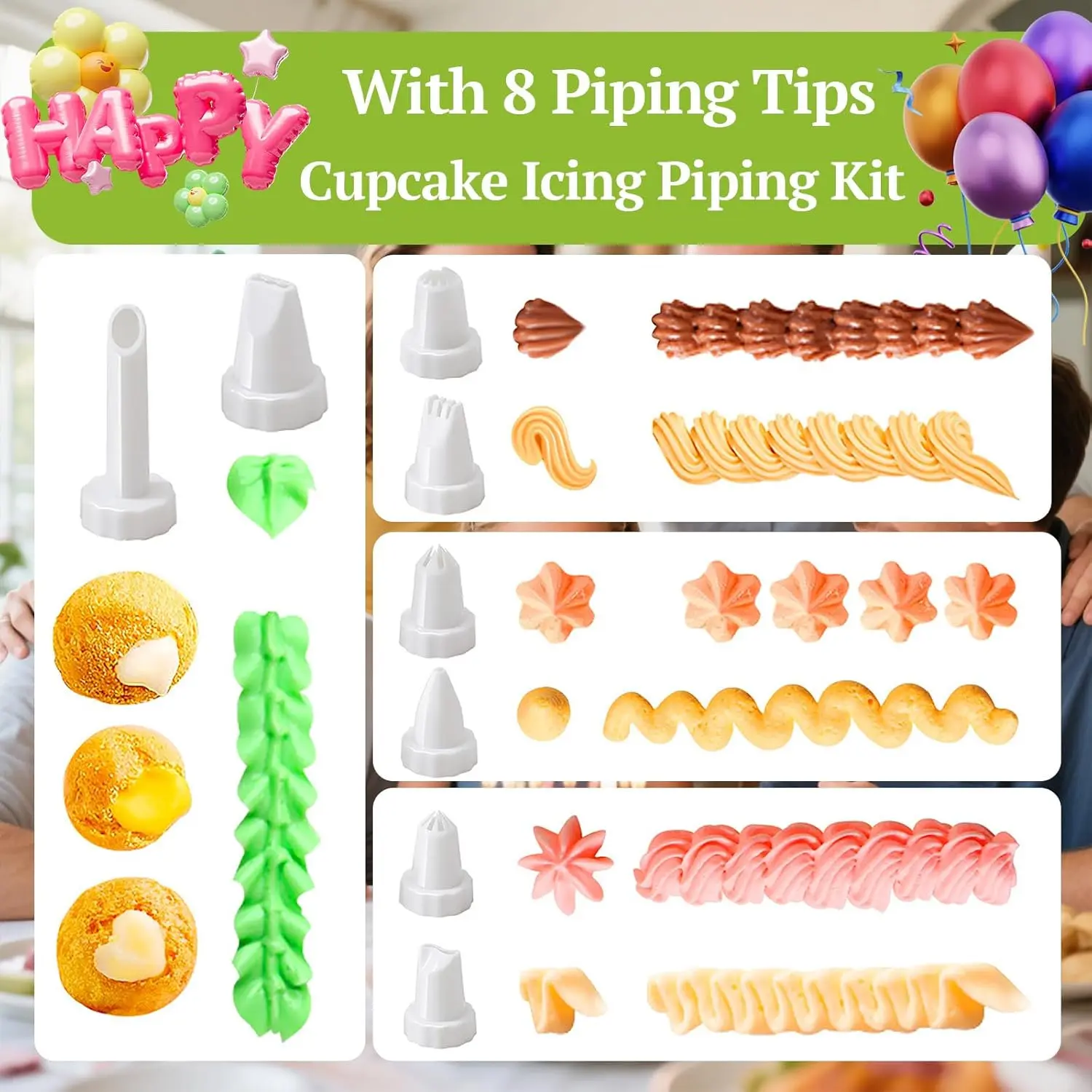 ·【Cake Decoration Tools】You will get a cupcake injector, 8 replaceable piping tips. These cake decorating tools can meet your cake and cookie decoration needs