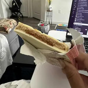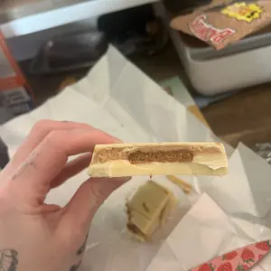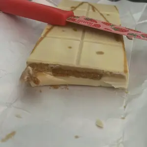 So it has the white chocolate smell. It’s very very crunchy. The inside is about as thick as a graham cracker. I can’t make the taste out, but it does taste very good. I highly recommend.