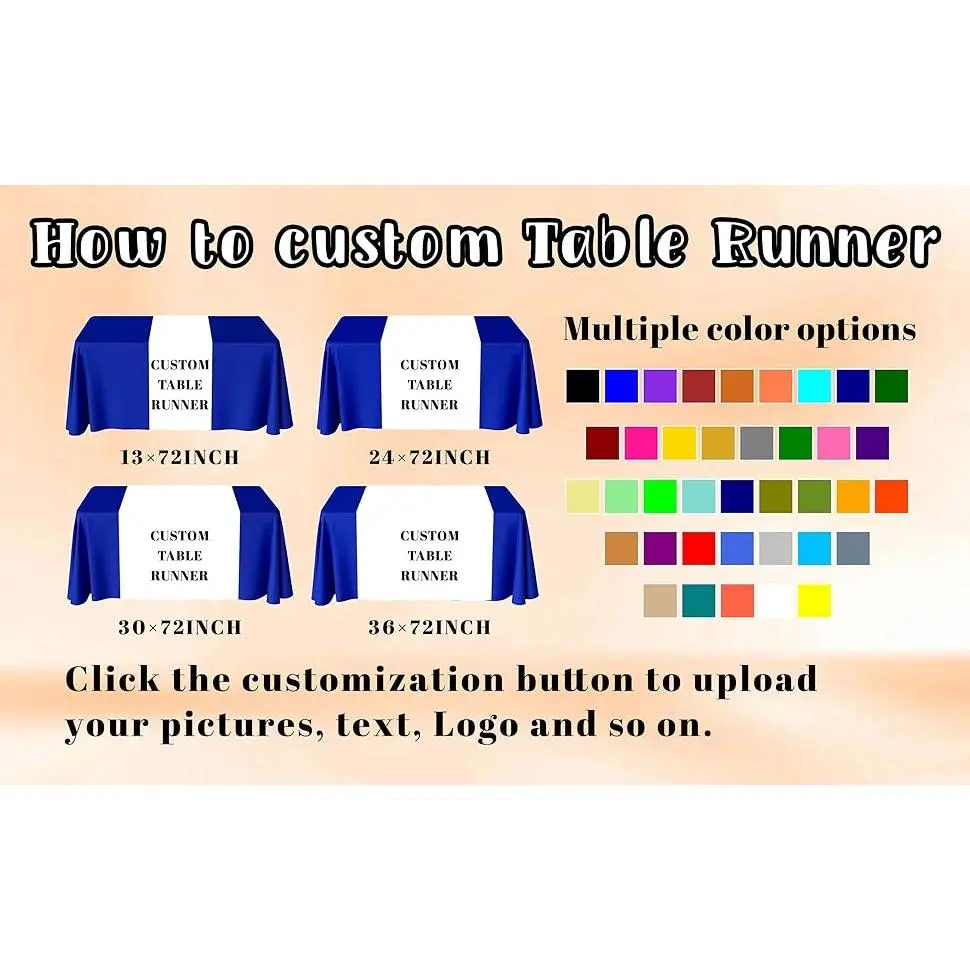 99.99% PolyesterCUSTOM TABLE RUNNER: Click "Customize Now" to select your favorite background color.Then add your own image, logo or text.Adjust your design freely until it satisfies you.Single sided printingMATERIAL & SIZE: Table runners are made of polyester fabric.72 inches long.There are 4 widths to choose from (13 inch, 24 inch, 30 inch and 36 inch).Custom or blank table runners are availableADD ATMOSPHERE: Light up your dining tables.Customize holiday themed table runners to add endless fun to your party.Protect your table from dust and scratches while adding color to your eventsWIDELY APPLICABLE: Our tablecloth runners are the best choice for party, wedding, farmhouse, banquet, trade exhibitions, and can also be used for hotel receptions, jewelry, and craft exhibitionsINTEGRITY SERVICE: Our service philosophy is to provide customers with a better shopping experience. If you have any questions, please consult us. We will do our best to solve it