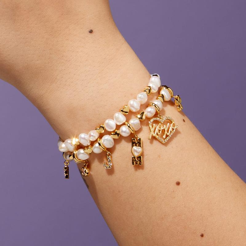 Enjoy our White Hearts by the Pearl Base Bracelet complete with freshwater pearls, gold-plated heart casted beads, and a stacker tag! It’s the perfect piece to let your charms shine while still working as a statement piece itself.