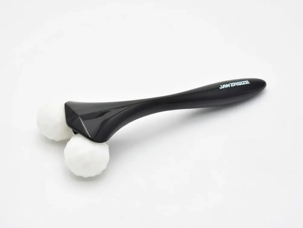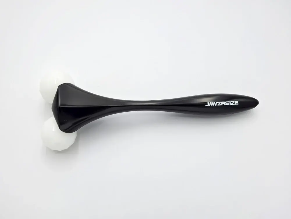The Jawz Roller features two polished white jade roller balls with carved angles that are intentionally designed to follow the natural contours of your face. Instead of rolling flat across the skin, the angled design creates better contact along the jawline, cheeks, and neck for a more guided and intentional warm-up.