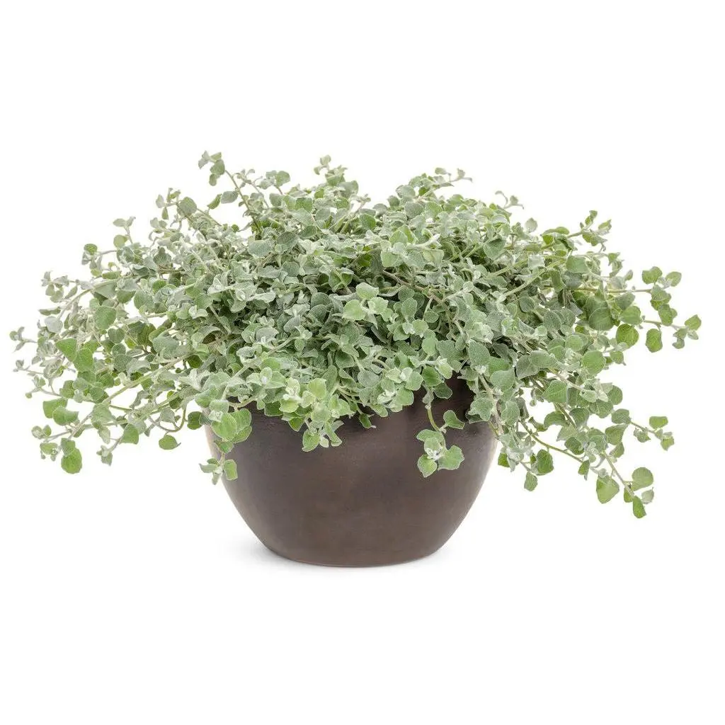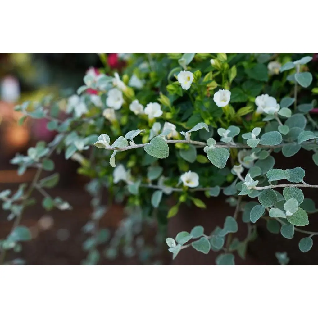 Highlight your plantings in silver with this gorgeous, low-maintenance trailer. First, there are the fuzzy leaves that beg to be touched, just waiting to create almost unlimited texture and color combinations. Sage-green leaf tops reverse to lambs-ear gray, the rounded leaves resembling beech leaves. It sparks amazing contrast with lime, red, black, purple, cream, orange, blue….This one is unfussy and fabulous, maxing out at 12 inches high by 20 inches wide.