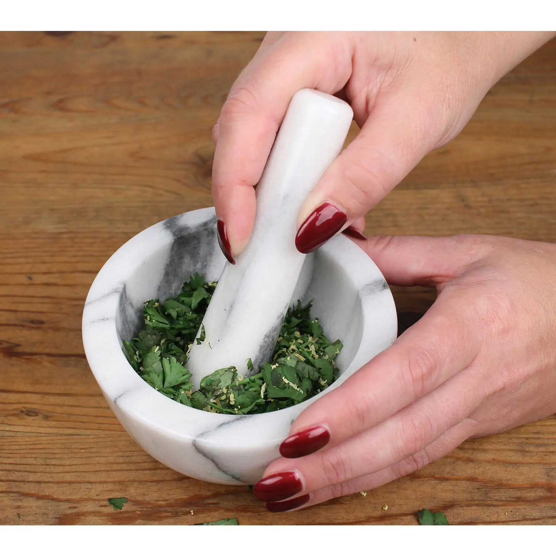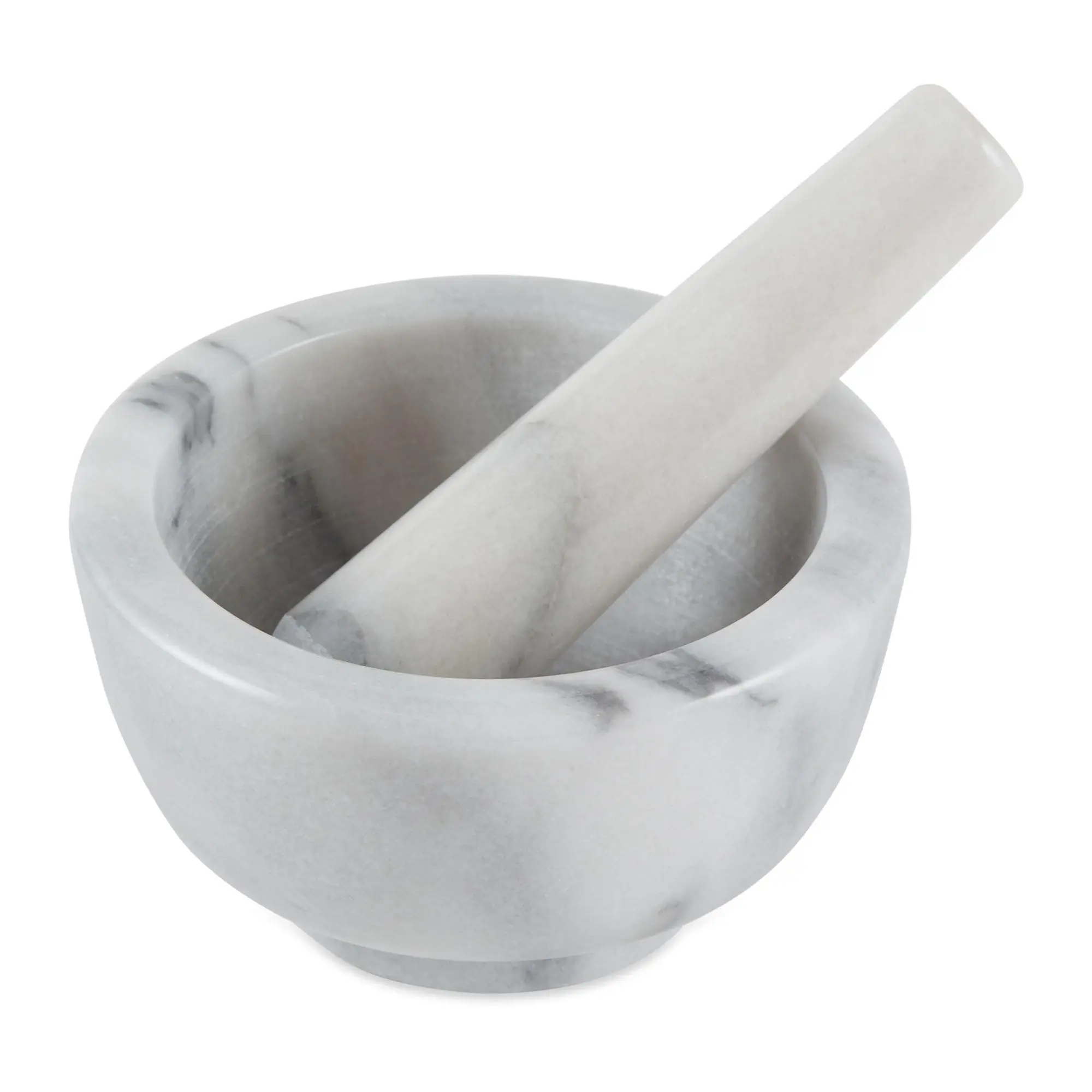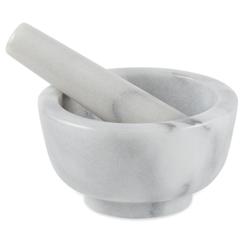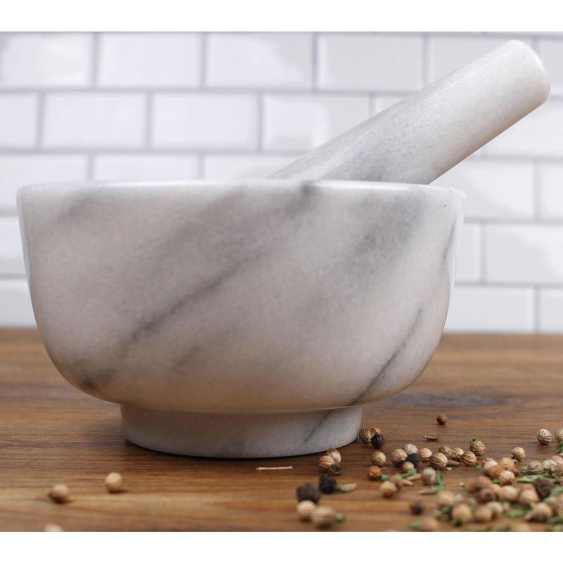 Grind fresh herbs, spices for homemade rubs, grains, or pills in this beautiful marble mortar and pestle. From RSVP.