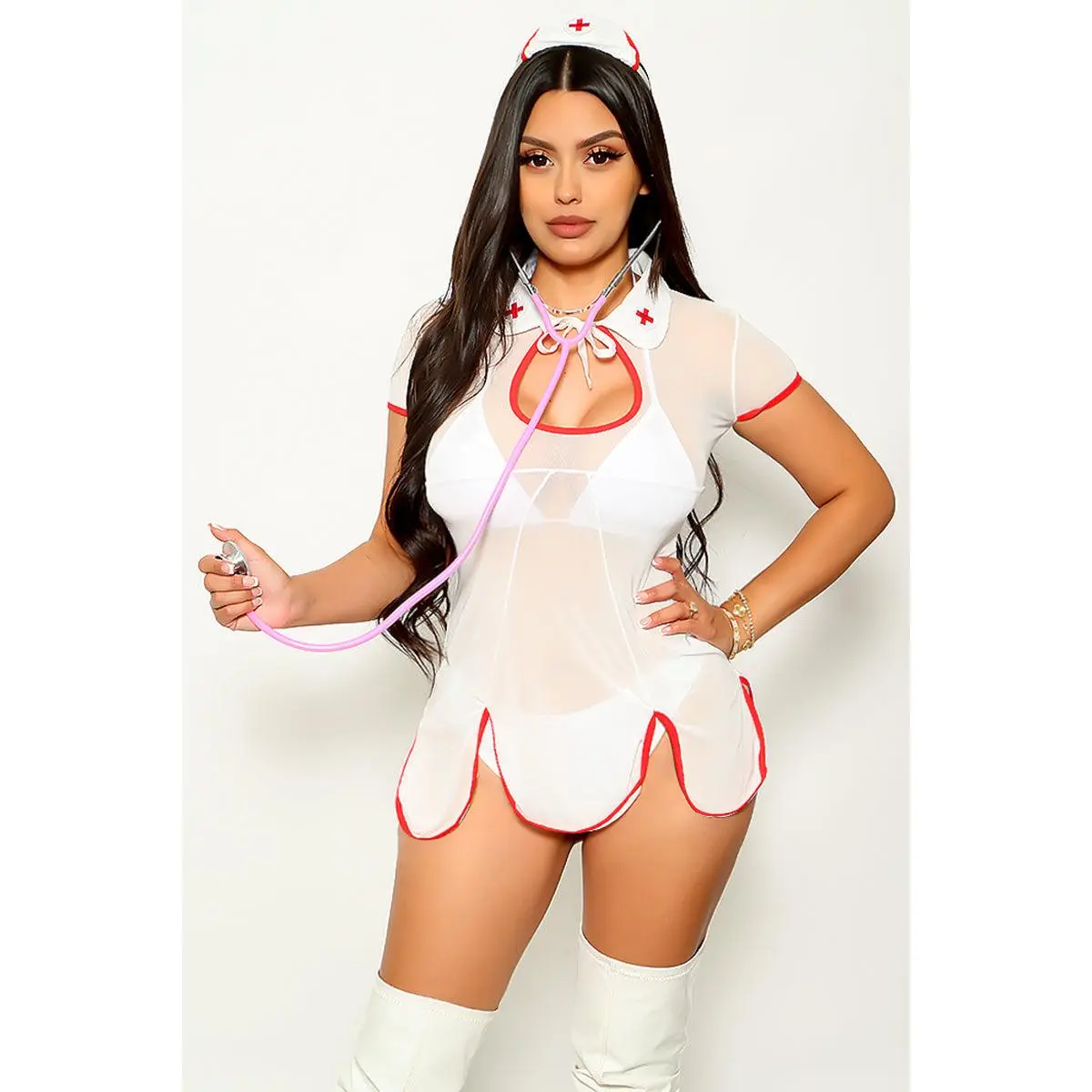 Transform into the sexiest nurse in town with our White Mesh Red Sexy Nurse Costume! The white mesh material adds a seductive touch, while the bold red accents make you stand out. Perfect for a playful night on the town or a fun costume party.