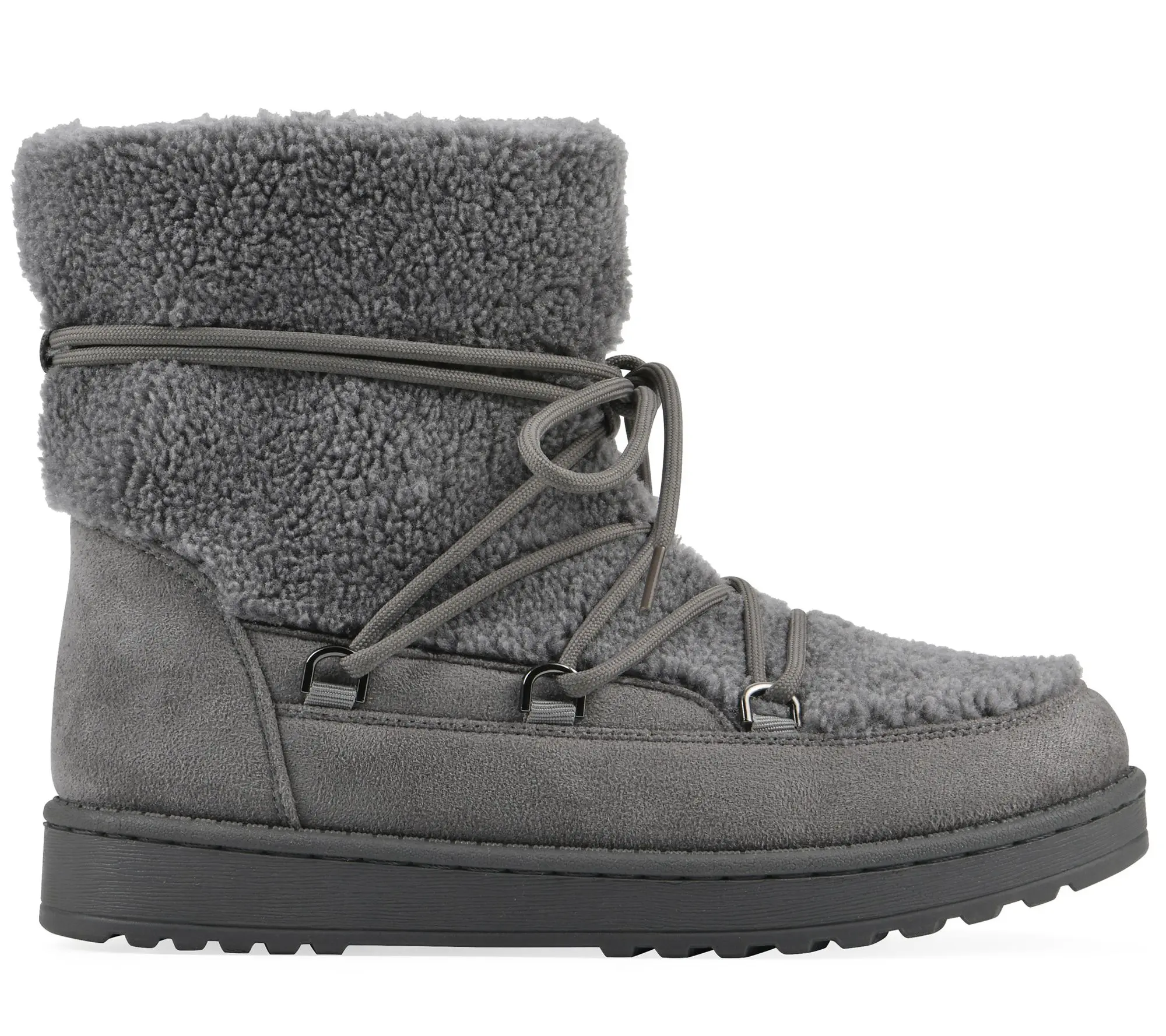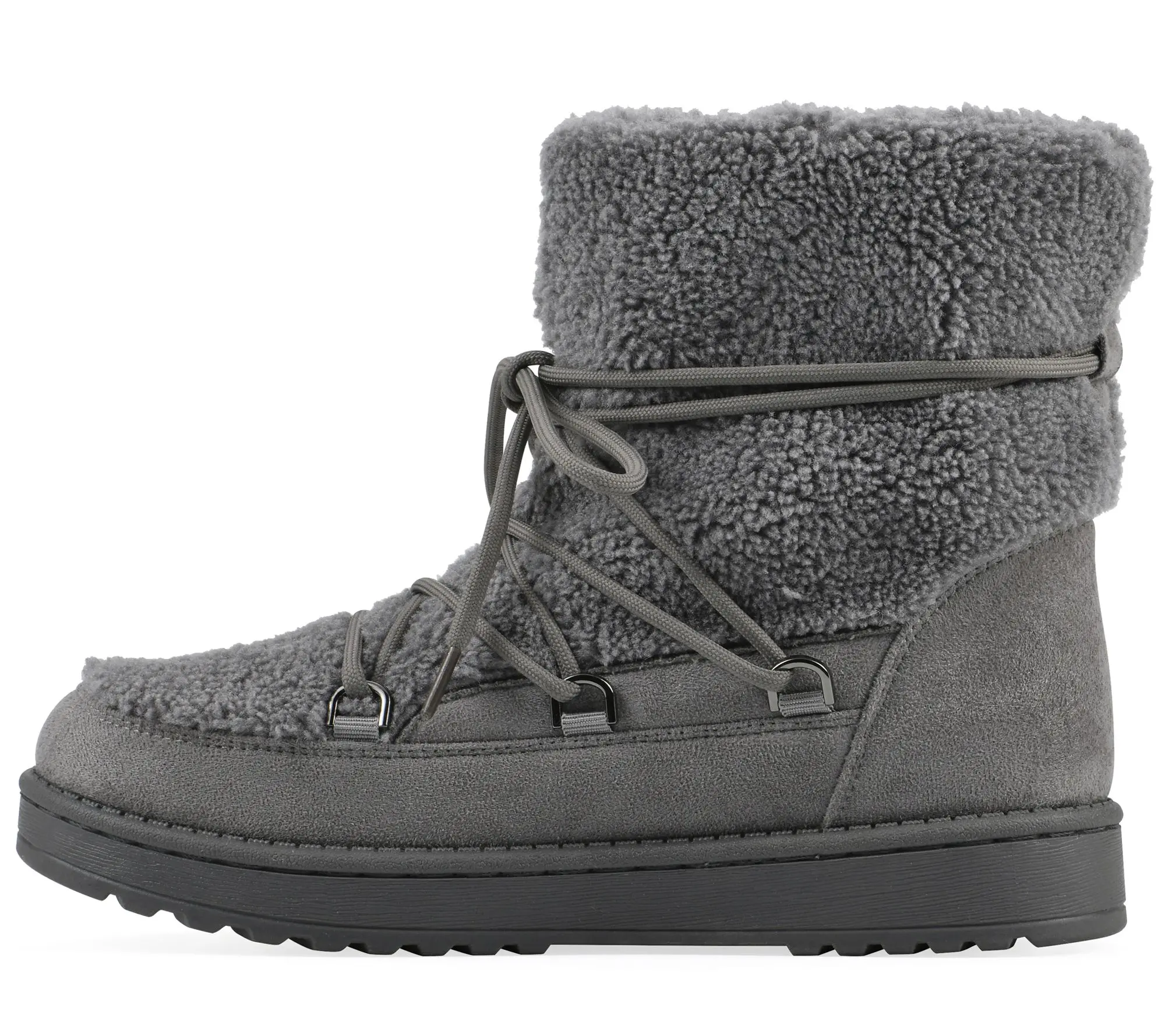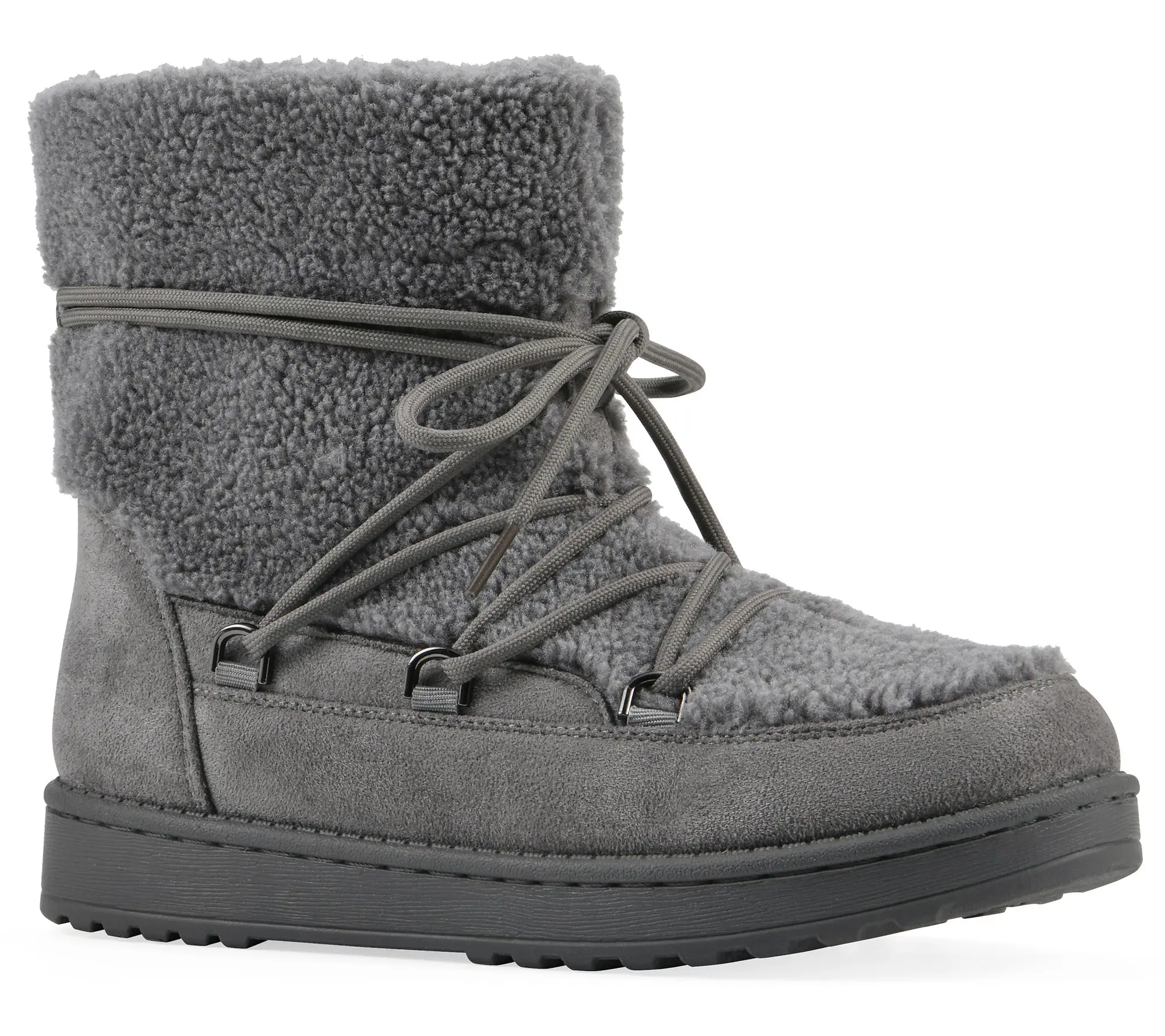 White Mountain Faux Fur Lace-Up Winter Boots - Isador. Pull on and lace up for a secure fit. Sturdy treaded outsole provides traction. Plush faux sherpa lining throughout. Content: faux fur/textile upper, lining, & sock lining, balance man made. Shaft height: 6". Opening Circumference: 13.5". Heel height:1". Sole thickness: 0.75". Fit: true to size. COO: Imported.
