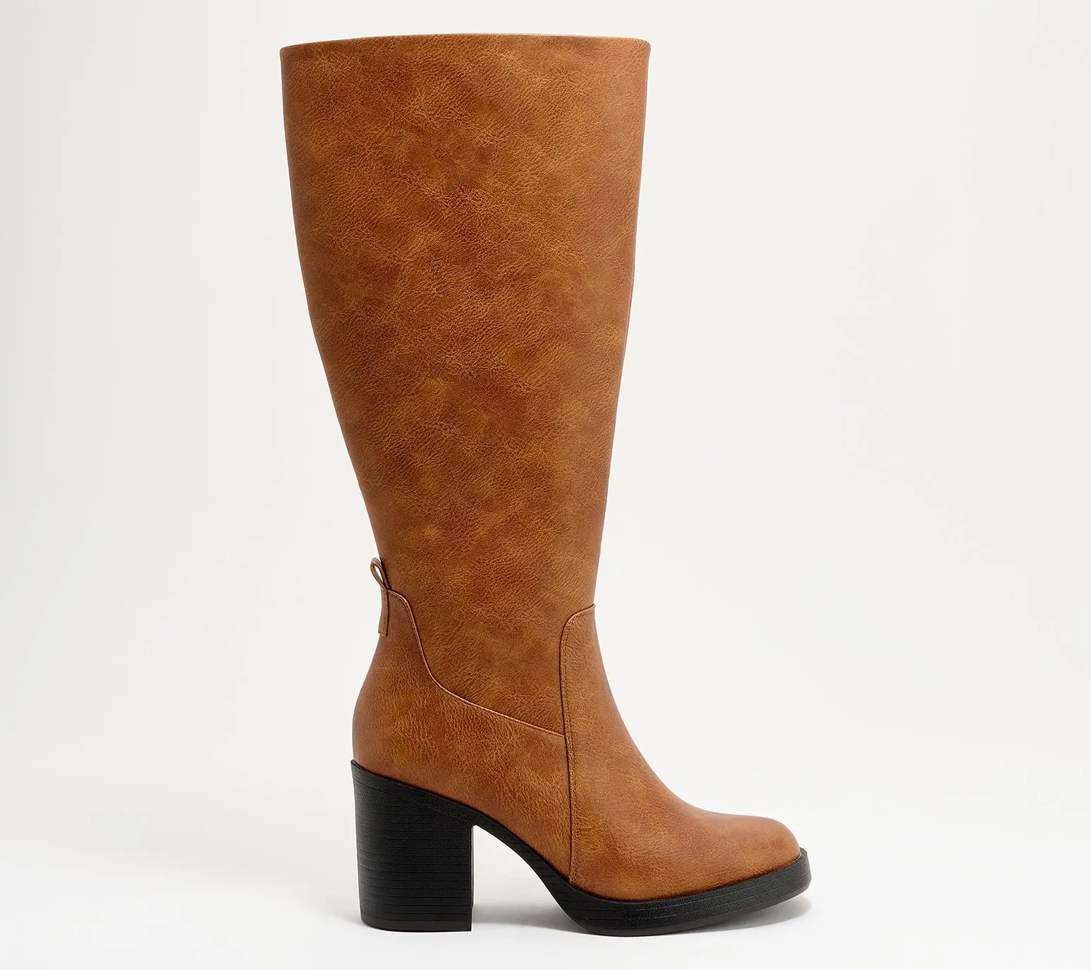 White Mountain Medium Calf Tall-Shaft Boots - Mackle. Faux leather upper. Full inside zip for easy on and off. Elastic gore at top of calf. Soft tricot lining and padded insole. Block heel and flexible outsole. Content: all man made materials. Shaft height: 14". Opening Circumference: 14.5". Heel height: 3". Sole thickness: 0.5". Fit: true to size. COO: Imported.