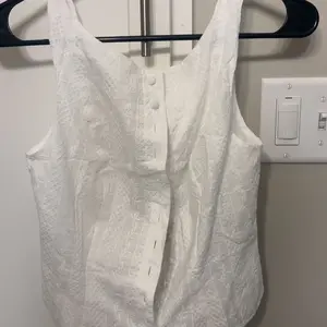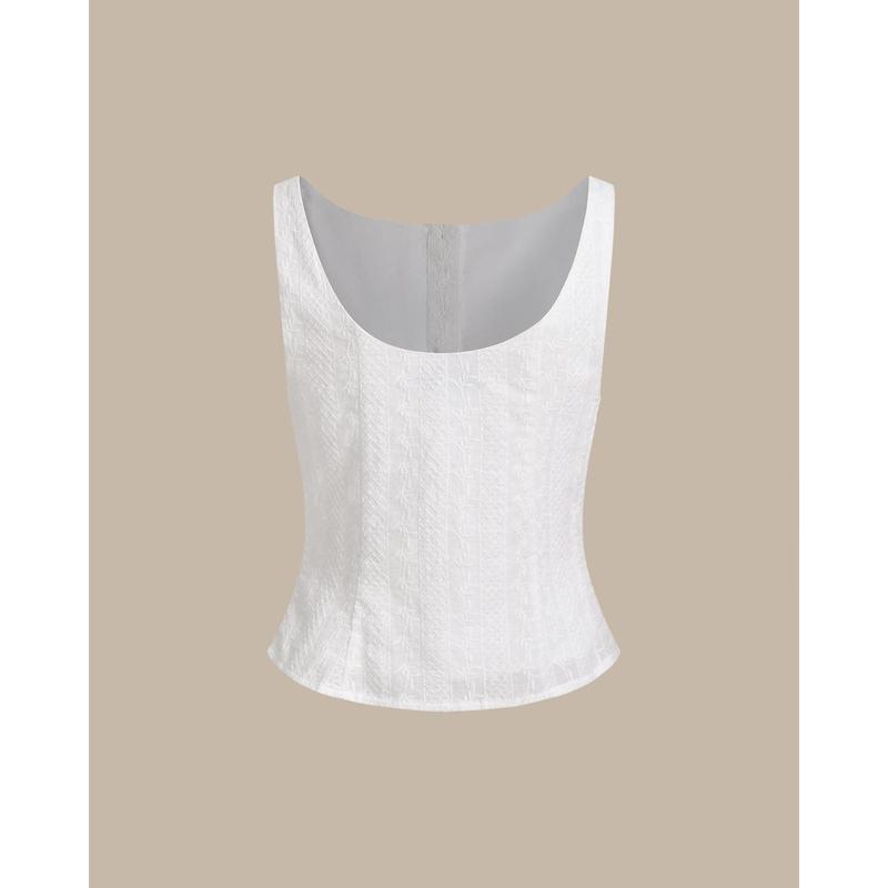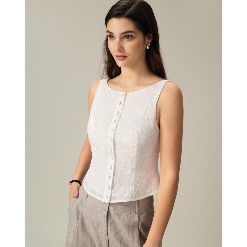 Description: Crafted from a soft, textured fabric, this vest features a classic boat neckline and a row of chic front buttons for a polished touch. Its minimalist design makes it easy to layer or wear on its own, perfect for pairing with high-waisted trousers, skirts, or shorts.