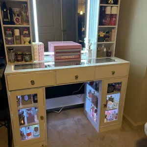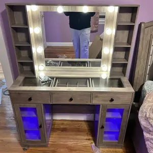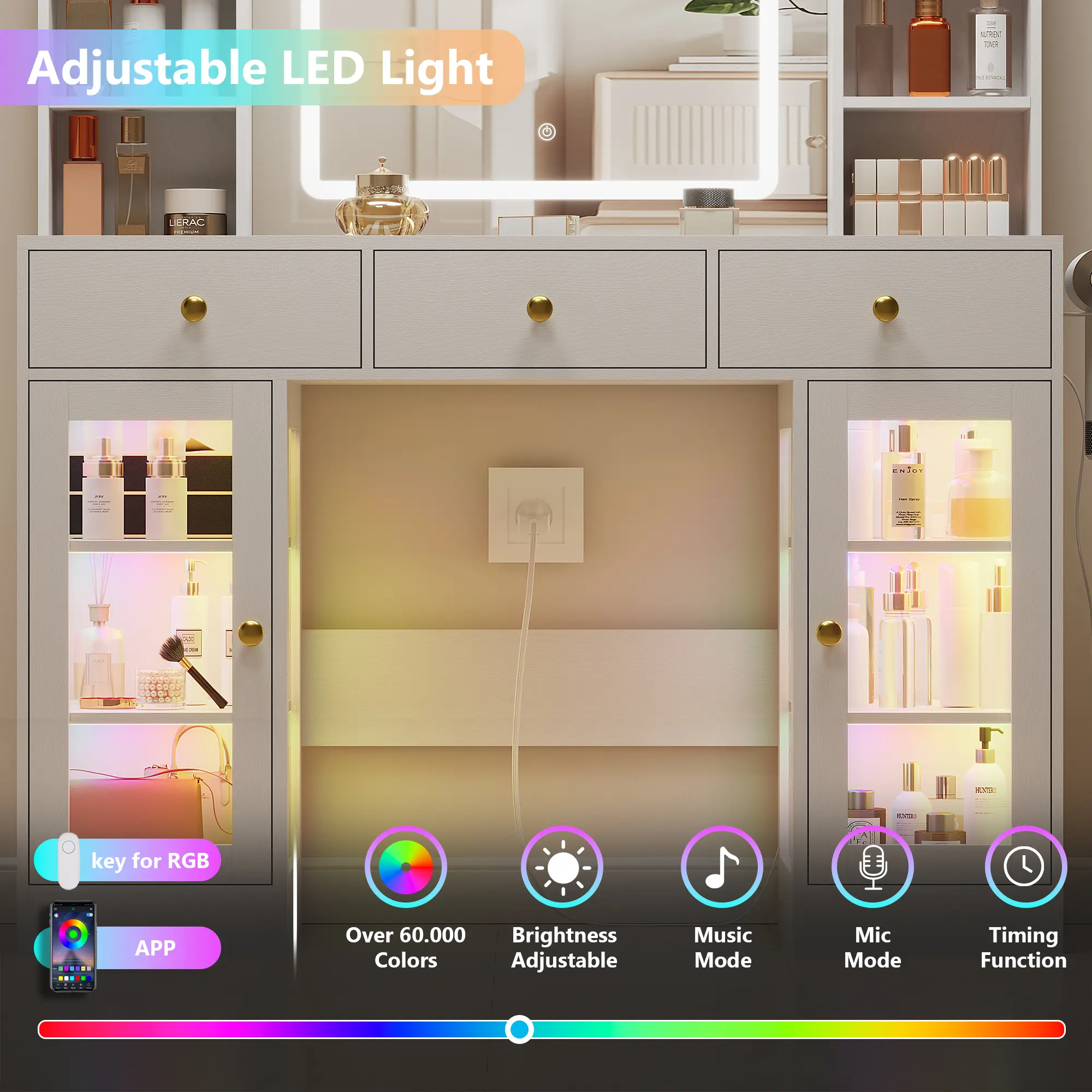 ·【BEAUTIFUL RGB DISPLSY CABINET】Large glass display cabinets adds beautiful extra RGB LED light system, which make the girls vanity a statement piece in your home. White vanity with led lights can be controlled via APP or the switch, with multiple dynamic modes, such as music mode, microphone mode and timing function. You can change LED light flashing with the rhythm of music.