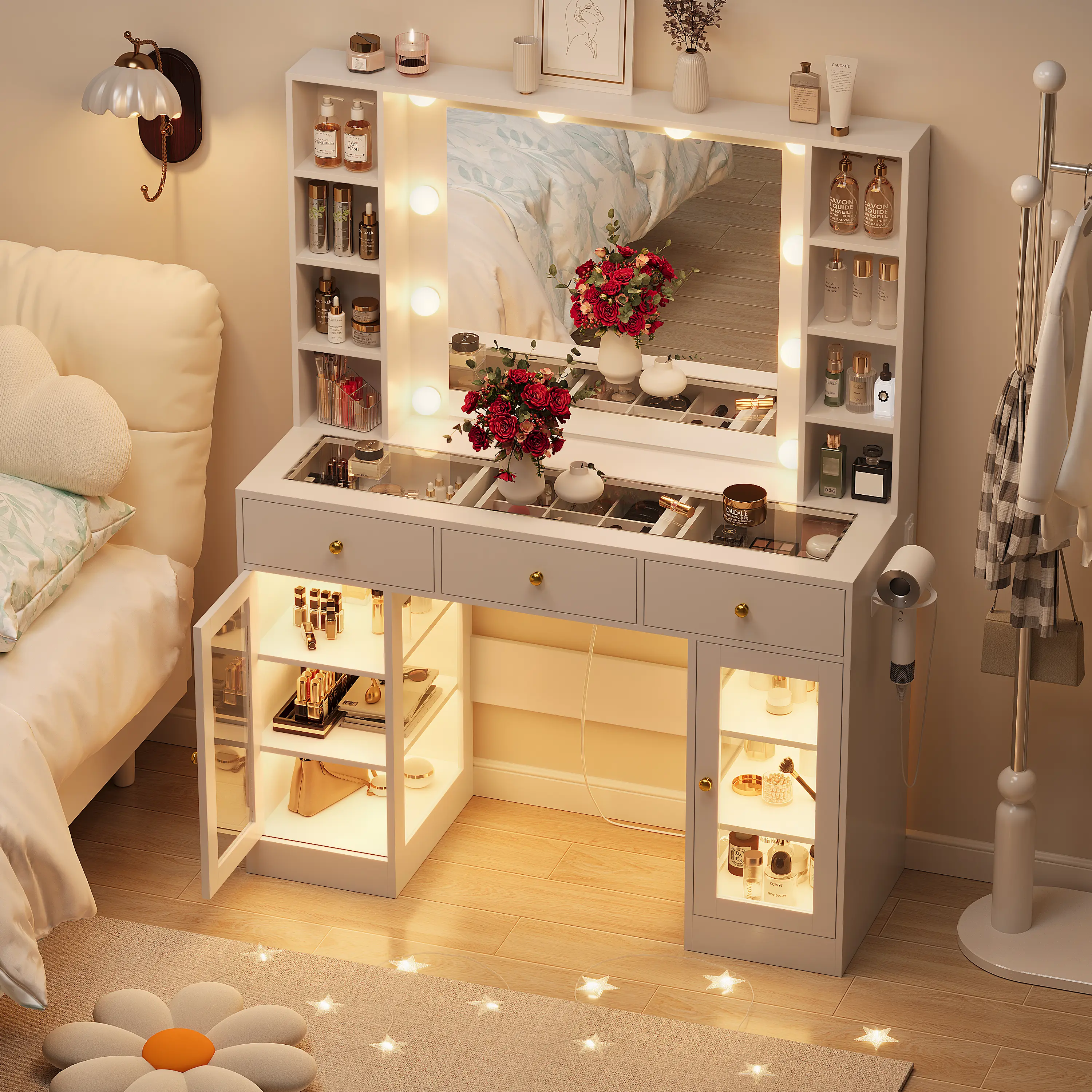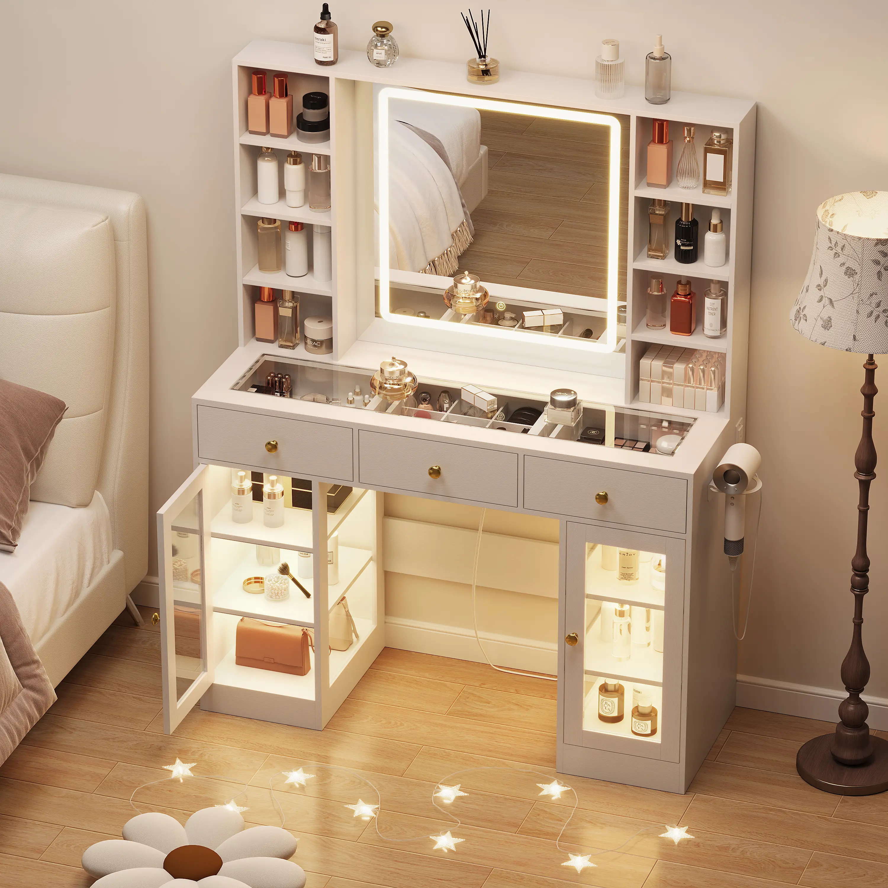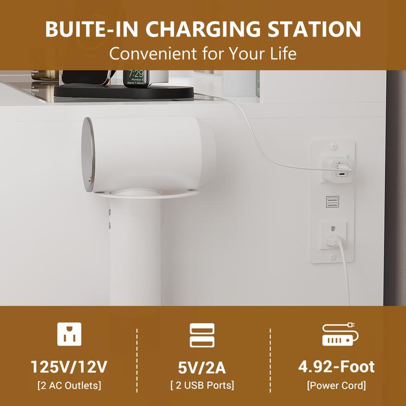 ·【VANITY WITH CHARGING STATION】White vanity with lighted mirror features the built-in power strip with 2 outlets and 2 USB ports, you can use eazily of curling irons, hair dryers, and phone charging. With a hair dryer rack on the right, so you don't worry again about turning off the lights and not being able to find hair tools.