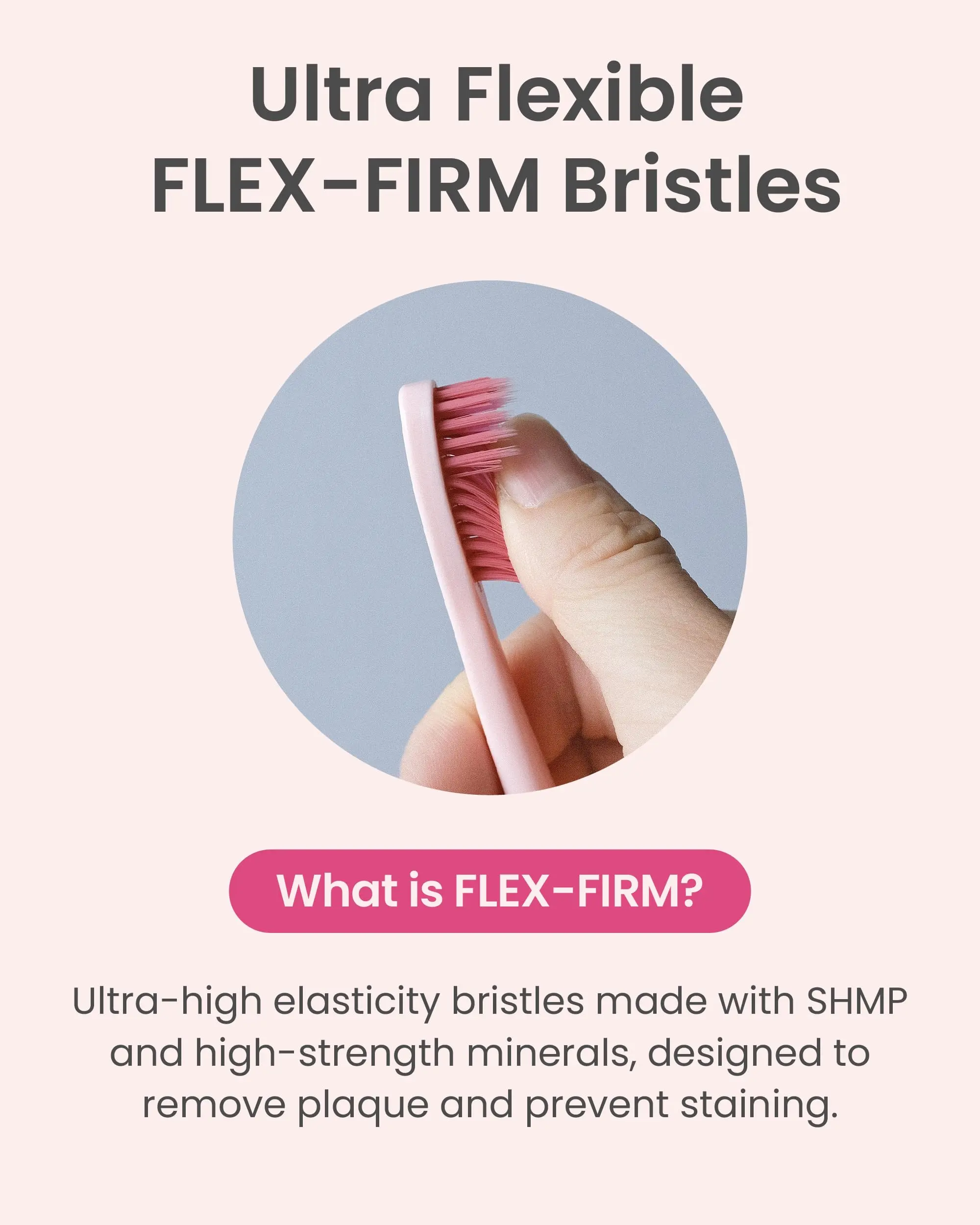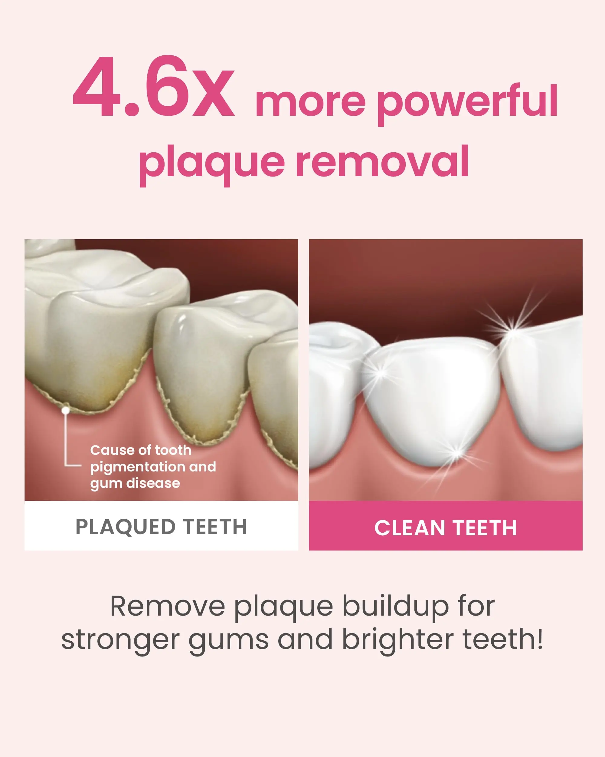Pink, with dual-tension bristles for an intense cleaning experience. Eliminates significantly plaque, reaching deep between teeth and along the gum line.