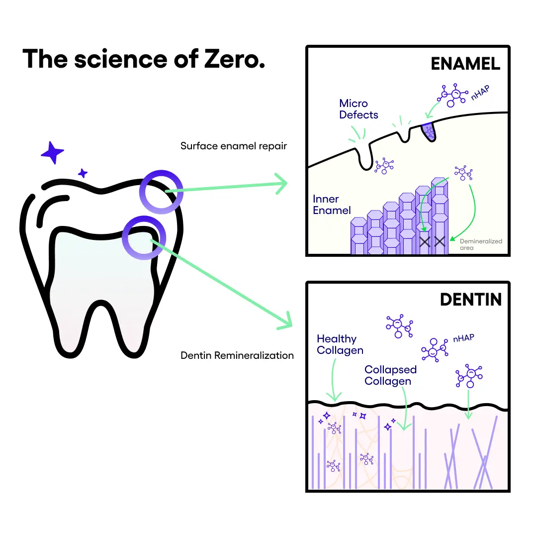 Zero Toothpaste: Water, Glycerin, Hydrated Silica, Hydroxyapatite (nHAp), Xylitol, Sorbitol, Stevia Rebaudiana Leaf Extract, Sodium Benzoate, Mentha Piperita (Peppermint) Oil, Coco-Betaine, Xanthan Gum, Potassium Sorbate, Mentha Arvensis Leaf Oil, Zinc Citrate, Violet 2