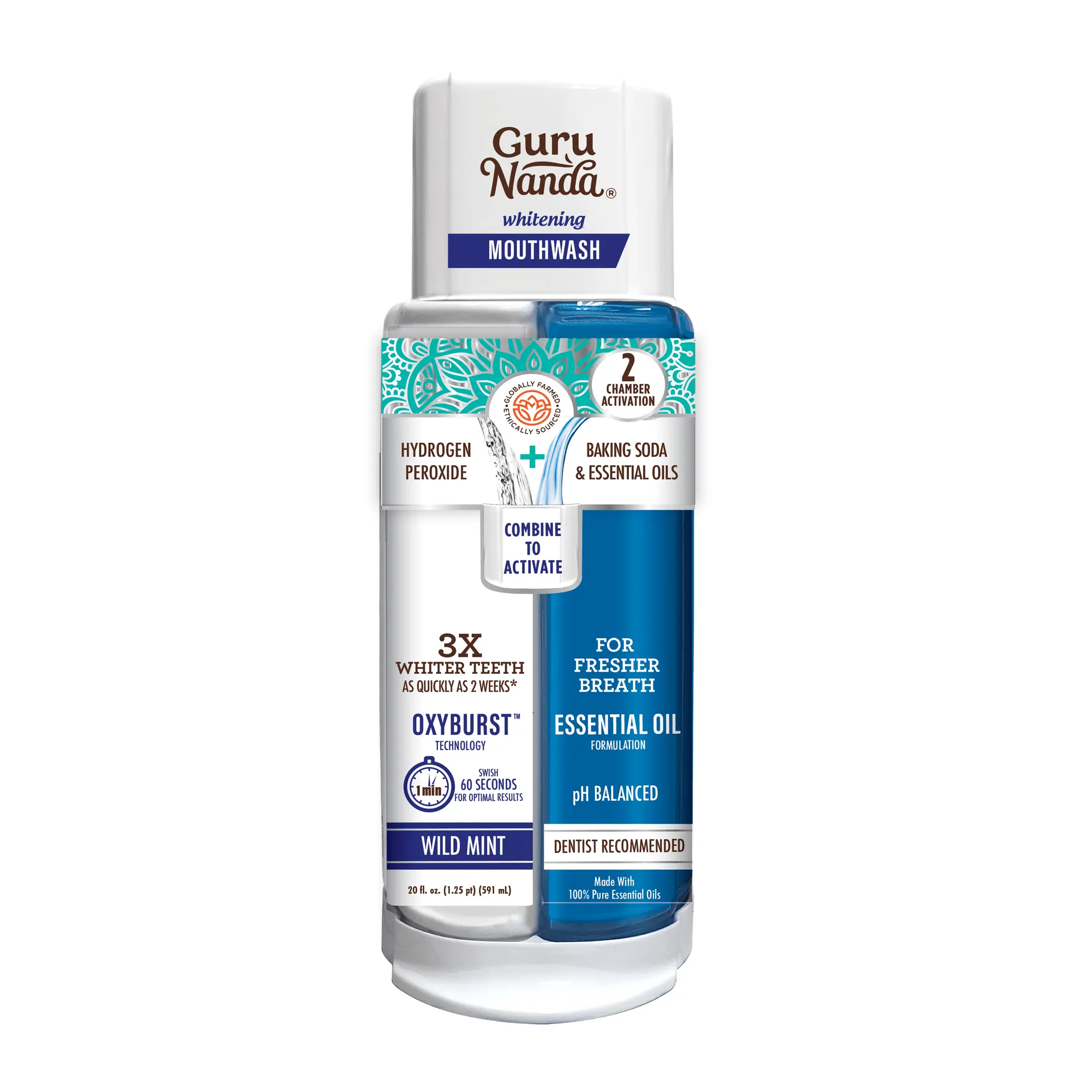 ADVANCED ORAL CARE SOLUTION: GuruNanda Dual Barrel Whitening Mouthwash is a fluoride-free, dual-chamber formula based on Ayurvedic principles. Hydrogen peroxide, natural ingredients, and vitamins work together to help remove bad breath and teeth stains for a refreshed and clean mouth.