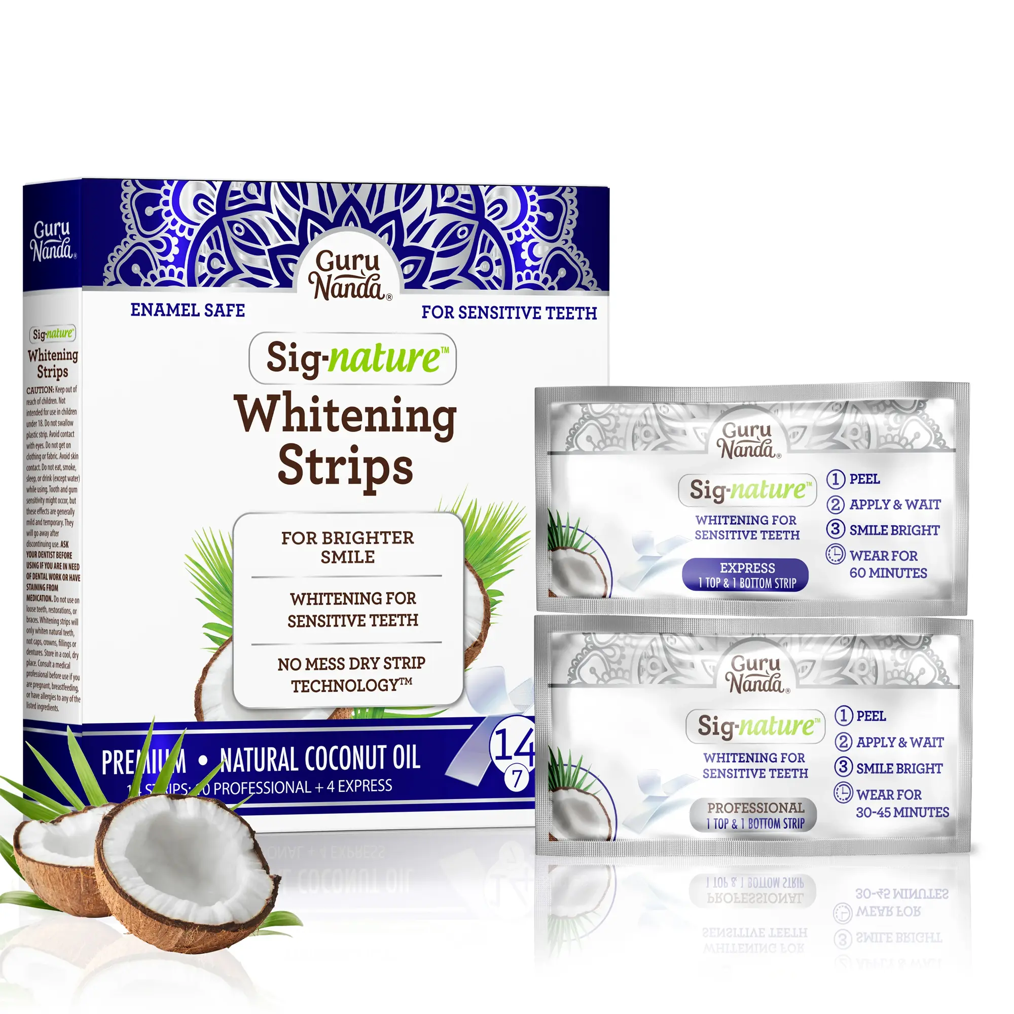 WHITENING STRIPS: Infused with natural coconut oil, Guru Nanda Coconut Teeth Whitening Strips are a great solution for teeth whitening for sensitive teeth and gums. It can help reduce tooth and gum sensitivity caused by hydrogen peroxide. The pure coconut oil in our strip helps refresh your breath and clean your teeth.