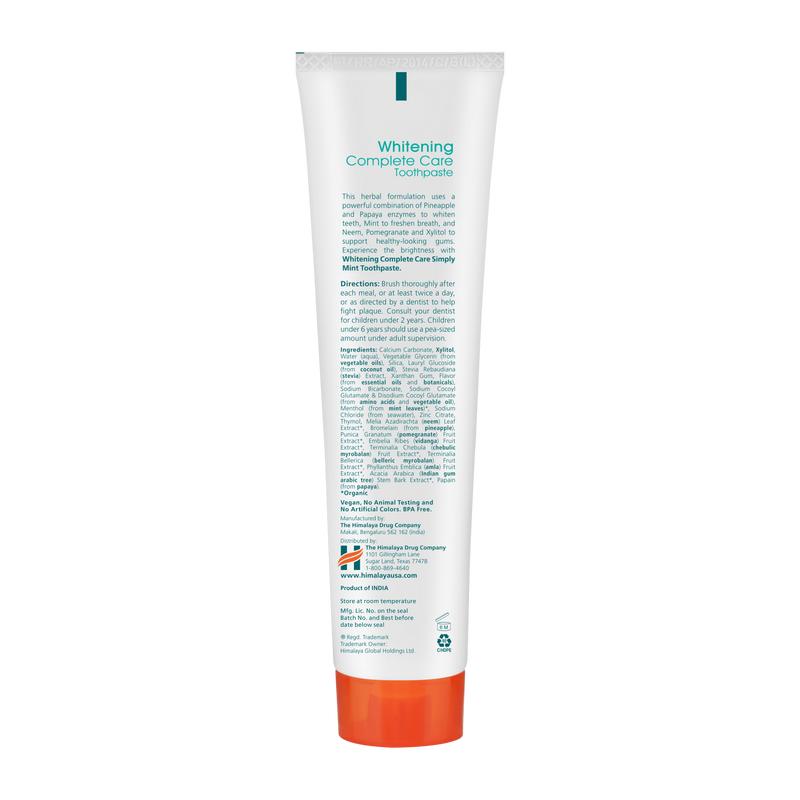 Ditch your whitening routine and come to the plant-based side! Whitening Complete Care Simply Mint Toothpaste leverages the enzymes from Papaya and Pineapple to help whiten your teeth while removing stubborn surface stains and offering a remarkably great taste and foamy texture you’ll love.