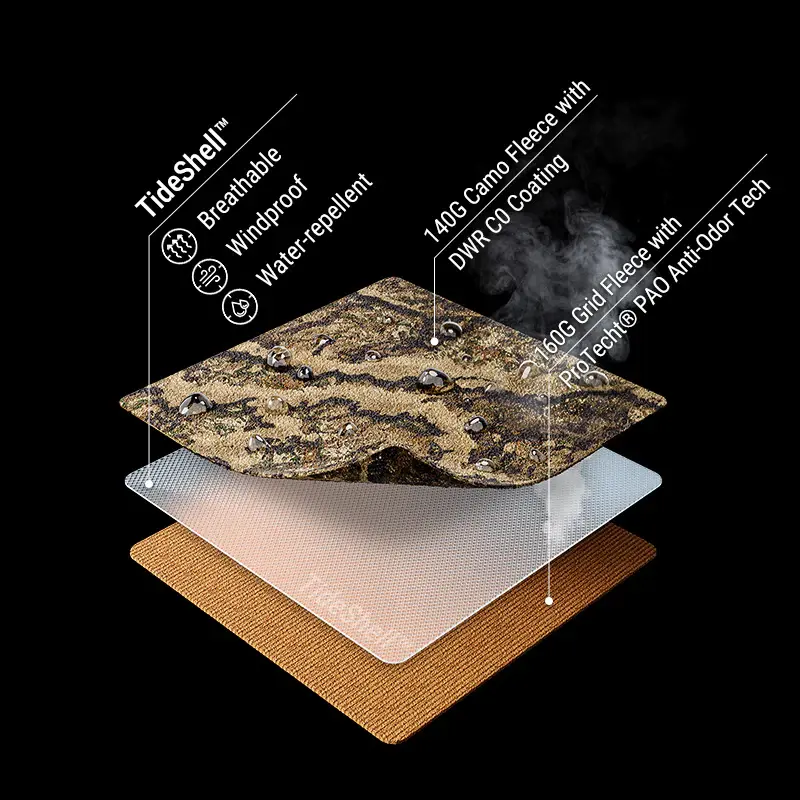 Designed for North American Whitetail hunters, this triple-layer fleece softshell offers windproof, water-repellent, and warmth-retaining performance with stealth-level quietness—perfect for cold, windy, and damp hunts from treestand or ground blind.