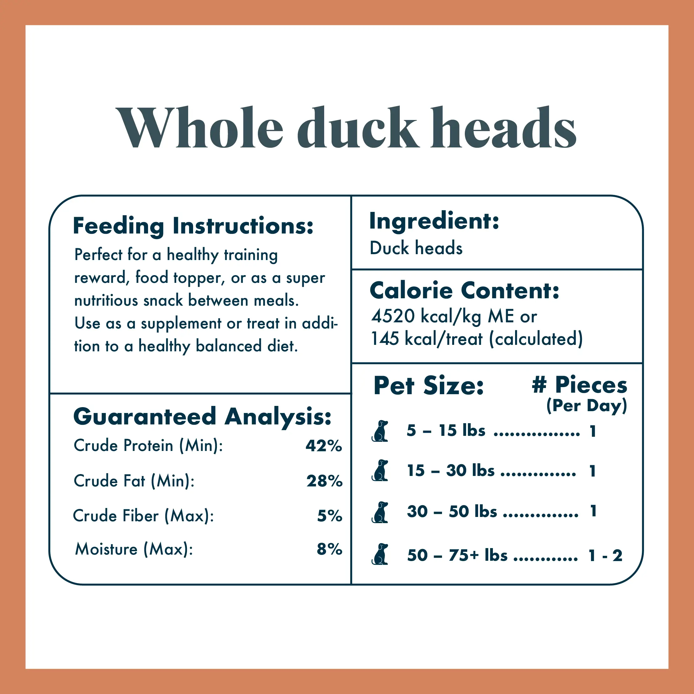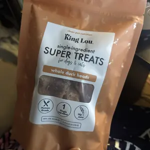 My dog absolutely loves these duck heads. They are a little creepy to look at but Orion goes nuts for them and they keep him busy for awhile and then because of the mental stimulation of trying to eat them he has a tendency of being chill for awhile which is rare for a Brittany Spaniel. Also they don't upset his stomach unlike most other well known company treats. 10/10 totally recommend as long as you are okay looking at them before giving to your pup.