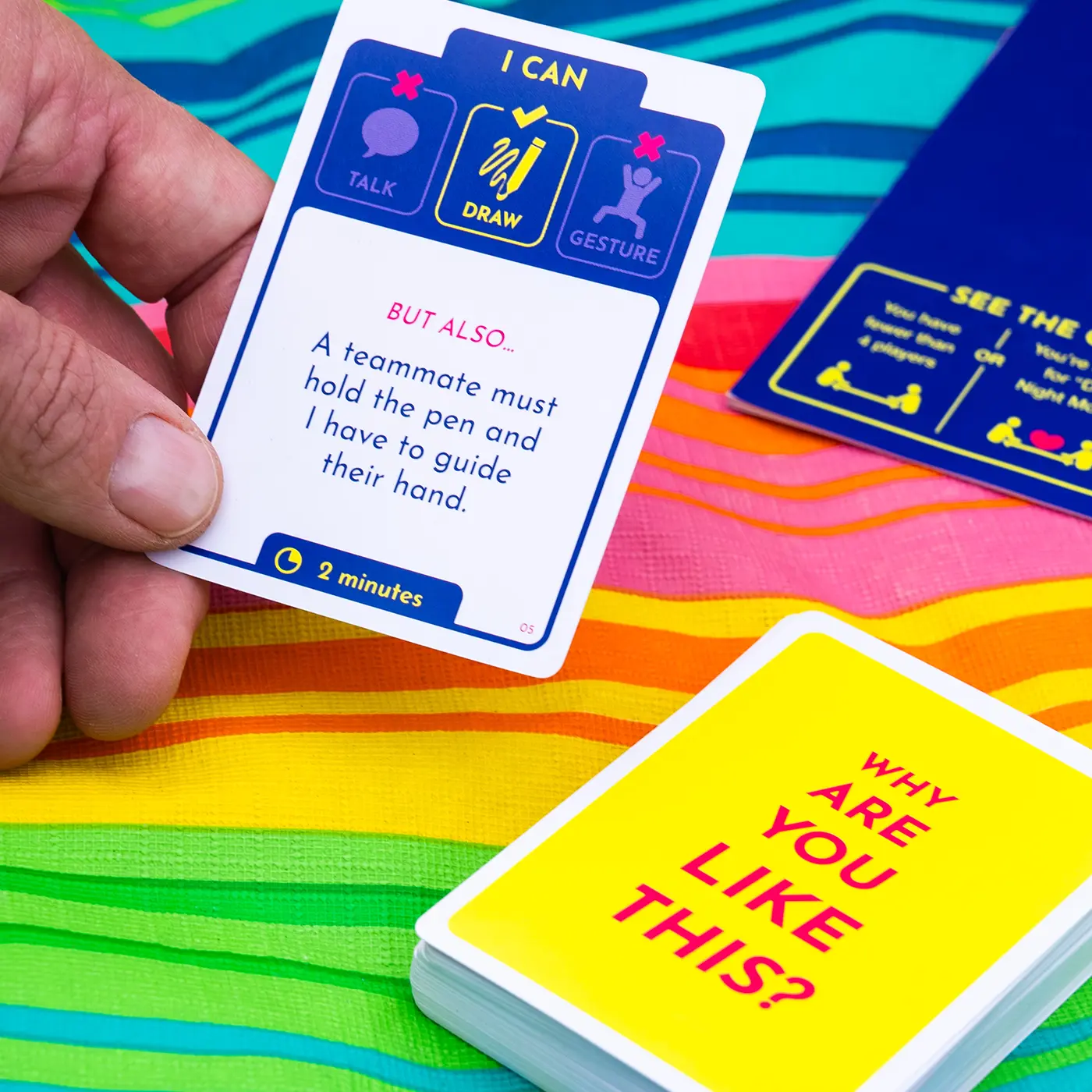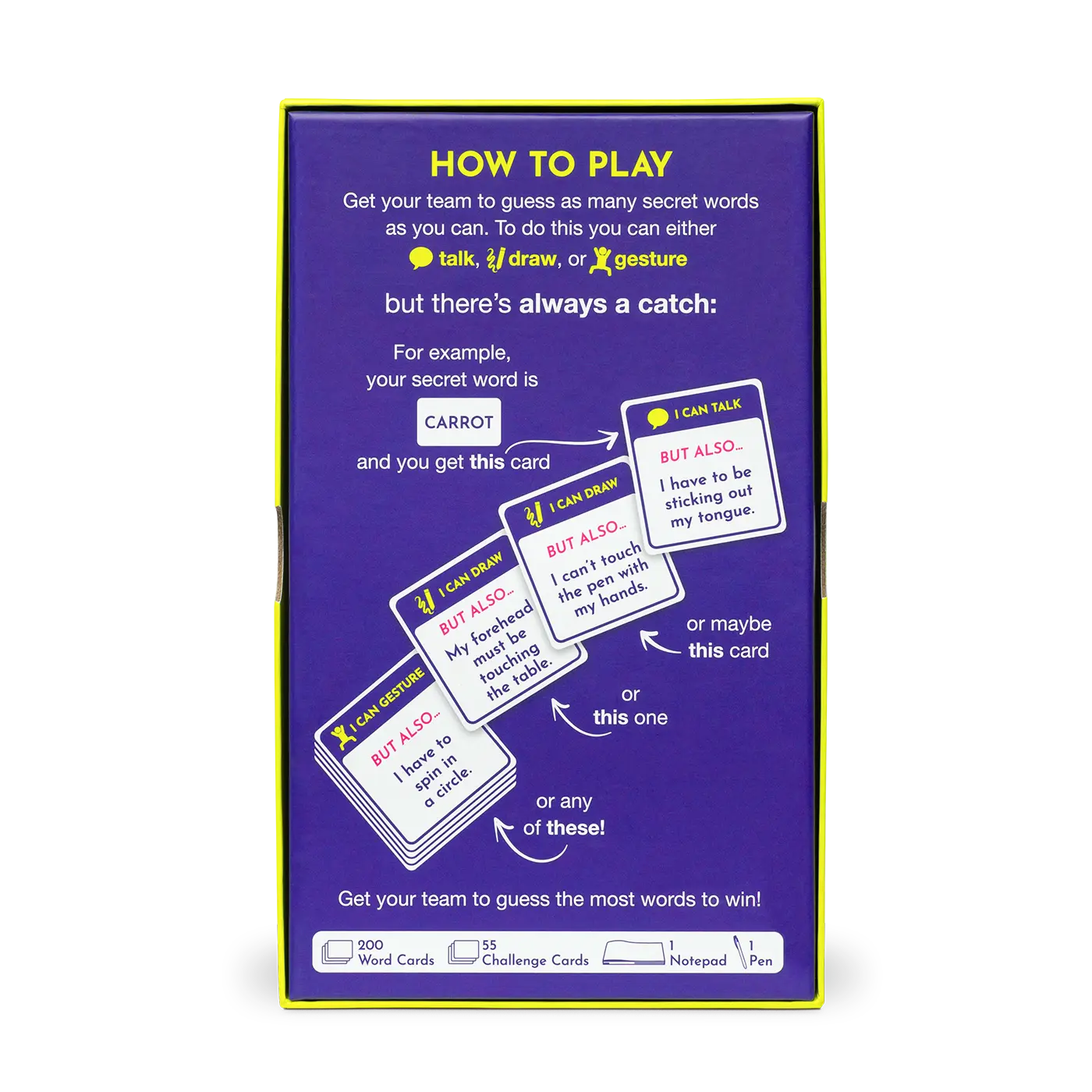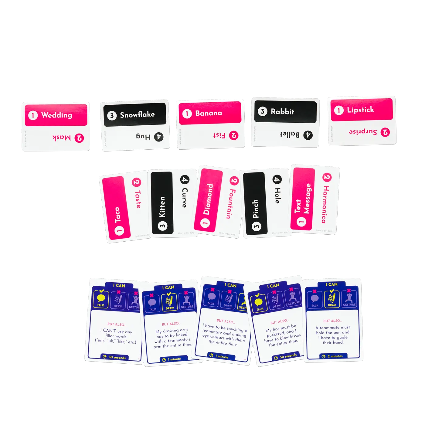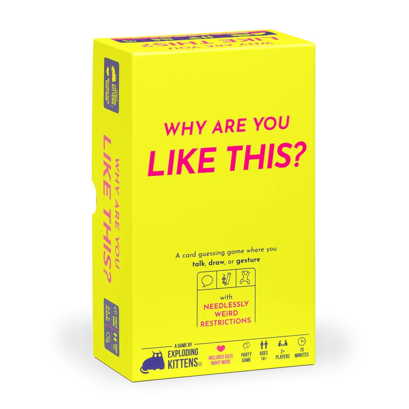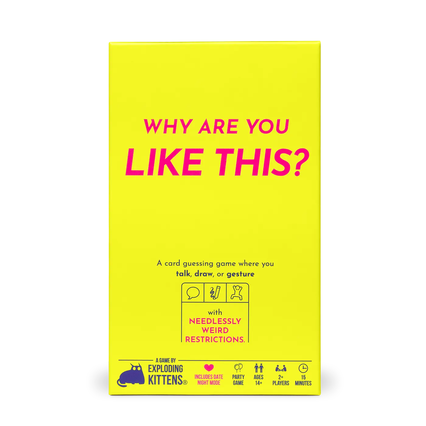This is another great game by Exploding Kittens. Talk, sure. Gesture, sure. Write, sure...but wait there's more to it than just that!!! Write but don't pick up the pen the whole turn. Gesture but don't say anything else. Talk but only in one syllable words...Those are just a few things you will have fun trying to do in this game. Date night mode for two players or party mode for 4+ players. Pick up a copy today and invite your friends over!!