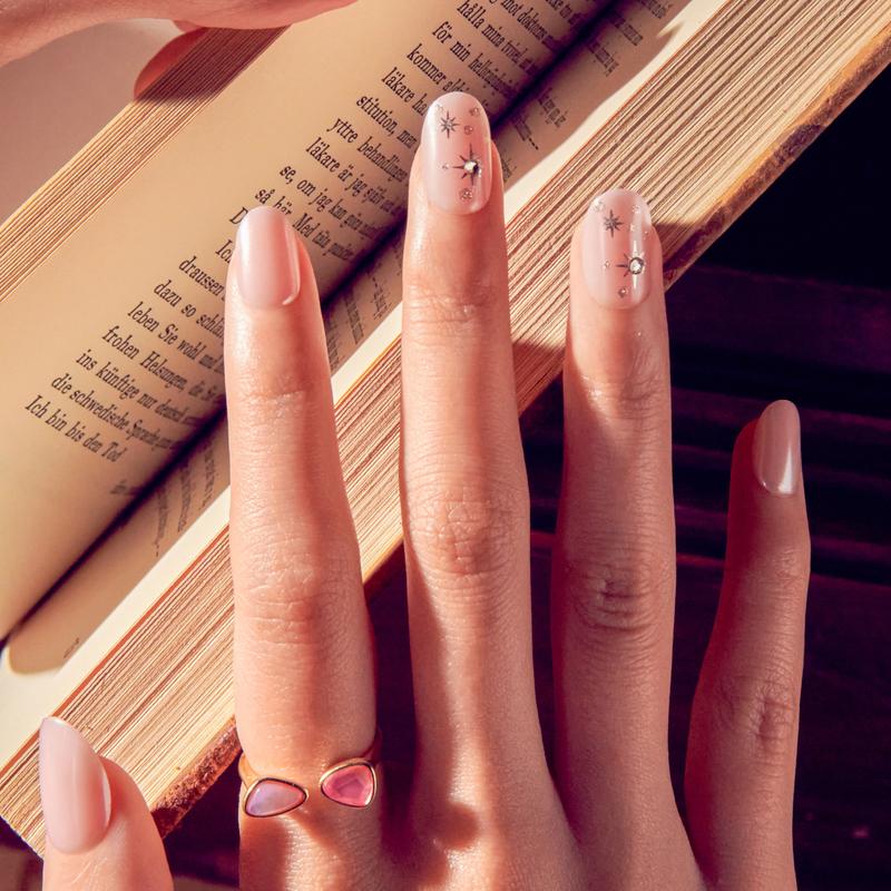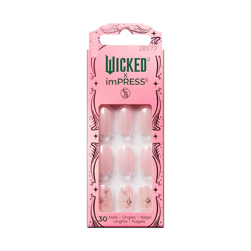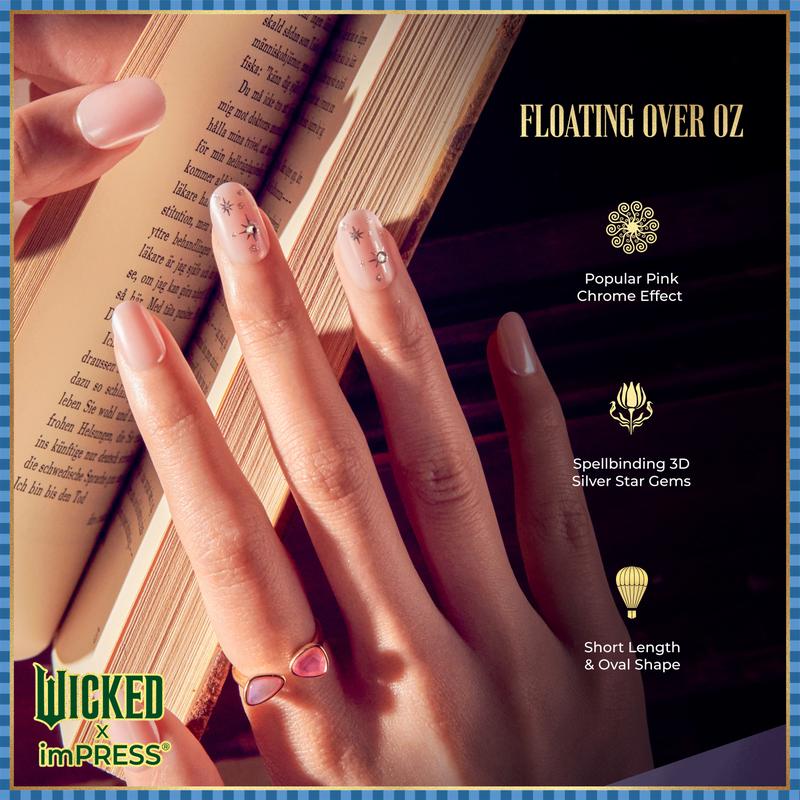 You’ll be ‘Floating Over Oz” with these thrillifying NO GLUE press on nails inspired by the movie, ‘Wicked’. Become the best witch of all in these perfectly pink solids featuring a spellbinding star design with 3D stones and a magical chrome effect.