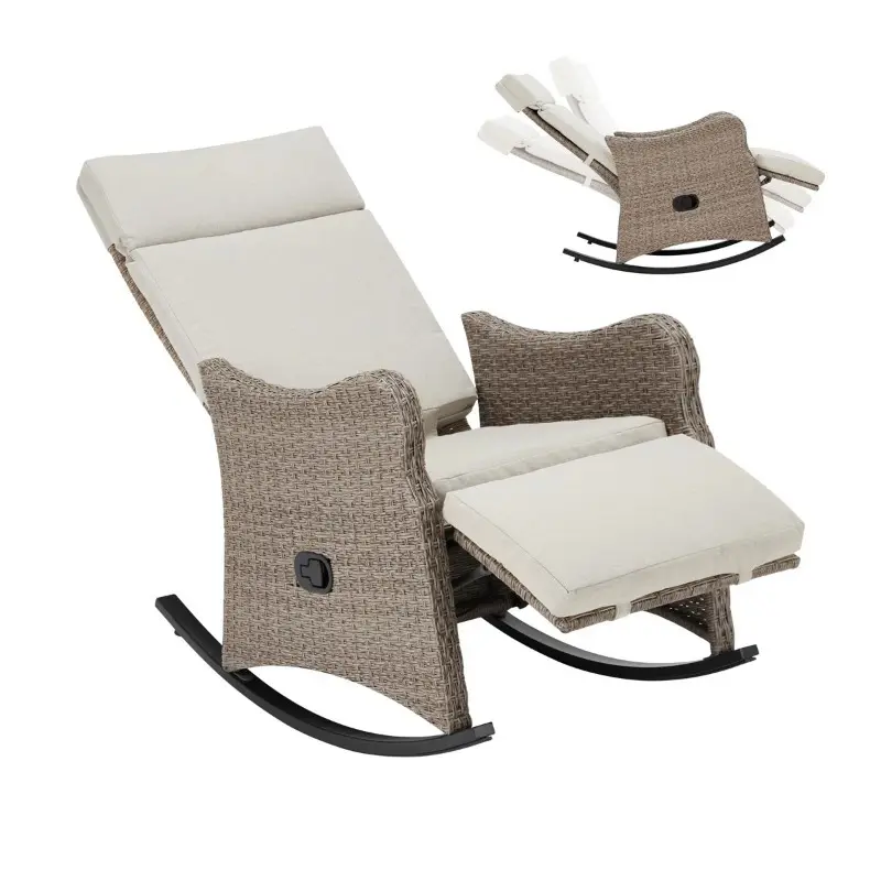 A great addition to patios, decks, balconies, gardens, or poolside areas, this reclining rocking chair creates a cozy space to unwind, read, or enjoy the fresh outdoor breeze.