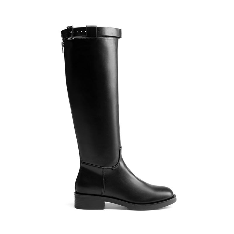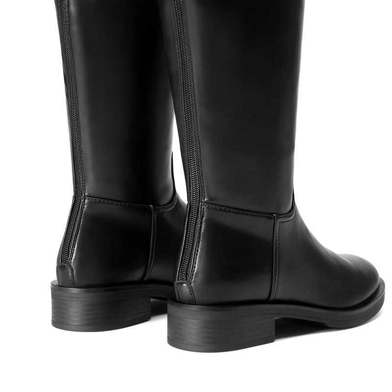 These versatile wide calf riding boots carry you through any occasion with ease. The structured knee-high shaft offers a flattering fit, with a metallic buckle strap on the opening for added style. The back zipper ensures easy entry, while the low block heel offers support and comfort for prolonged wear. The 6mm seam around the sole gives these boots a bold touch.