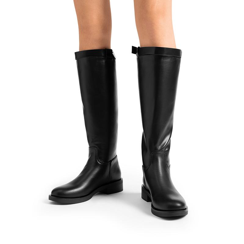 5. Chic Wide Calf Riding Boots with Metallic Buckle & Low Block Heel – Stylish and Comfortable for Any Occasion