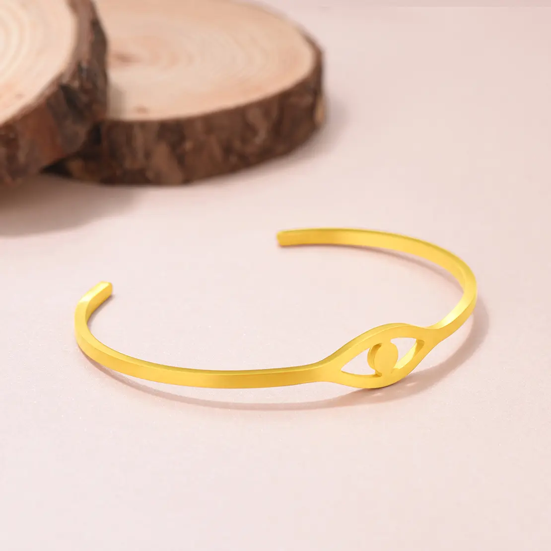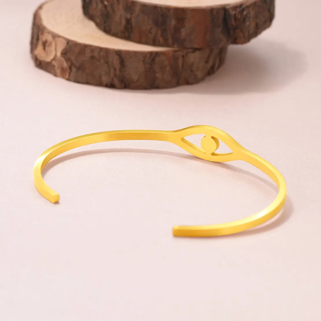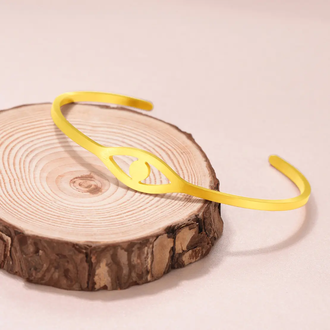 Explore FindChic's Golden Wide Cuff Evil Eye Bracelet: Adjustable and chunky, perfect for women, men, birthdays, weddings, and gifting occasions. A stylish protective accessory.
