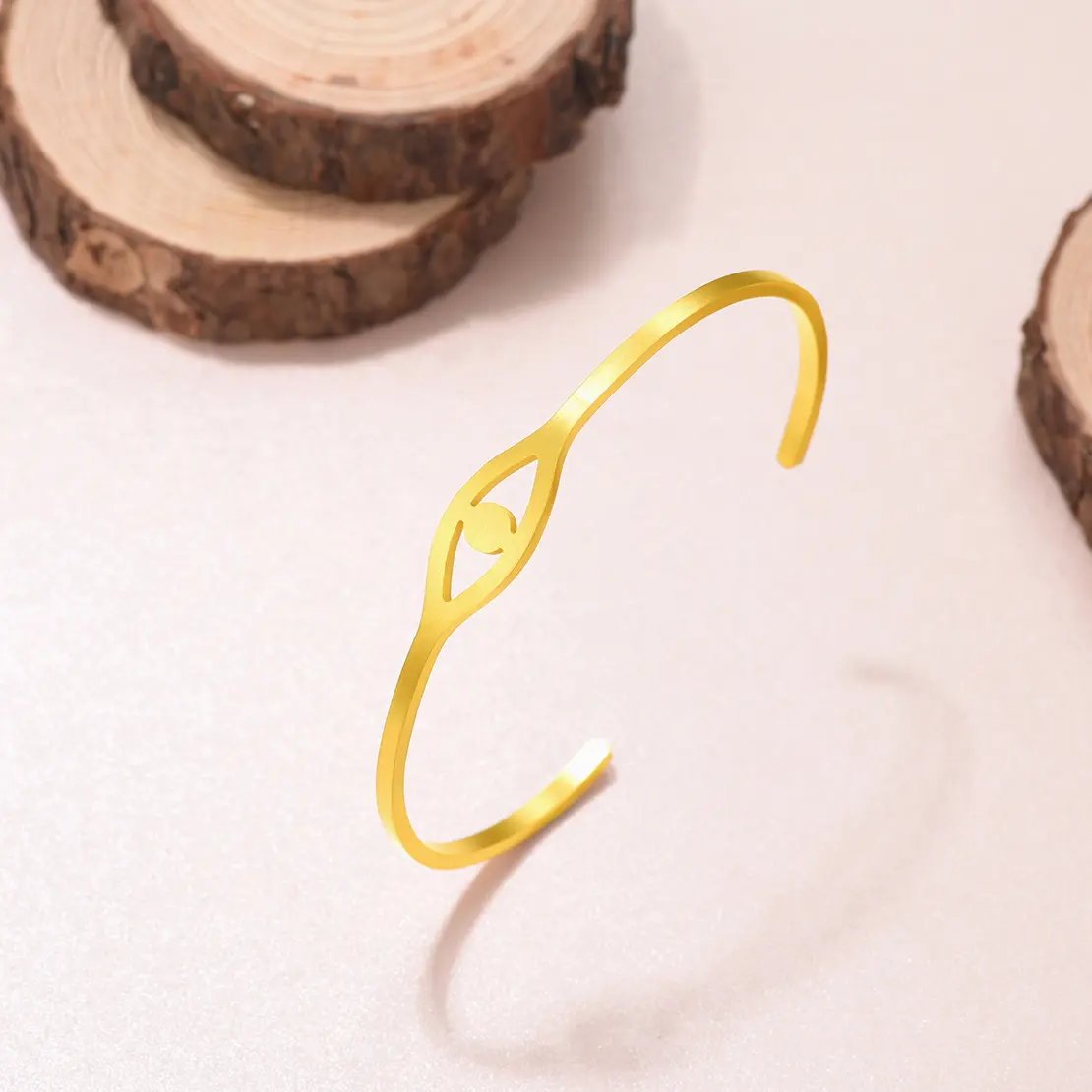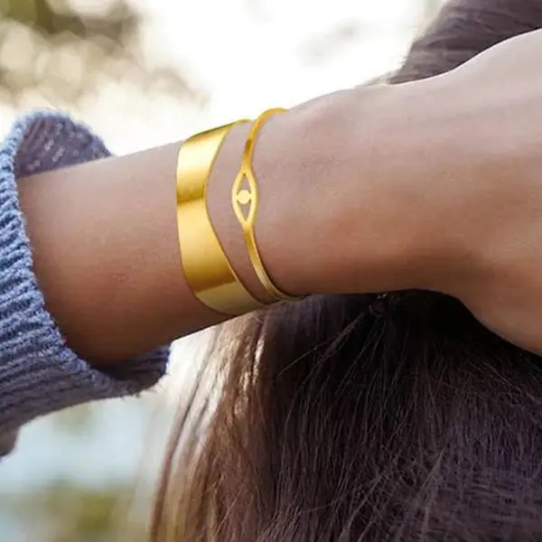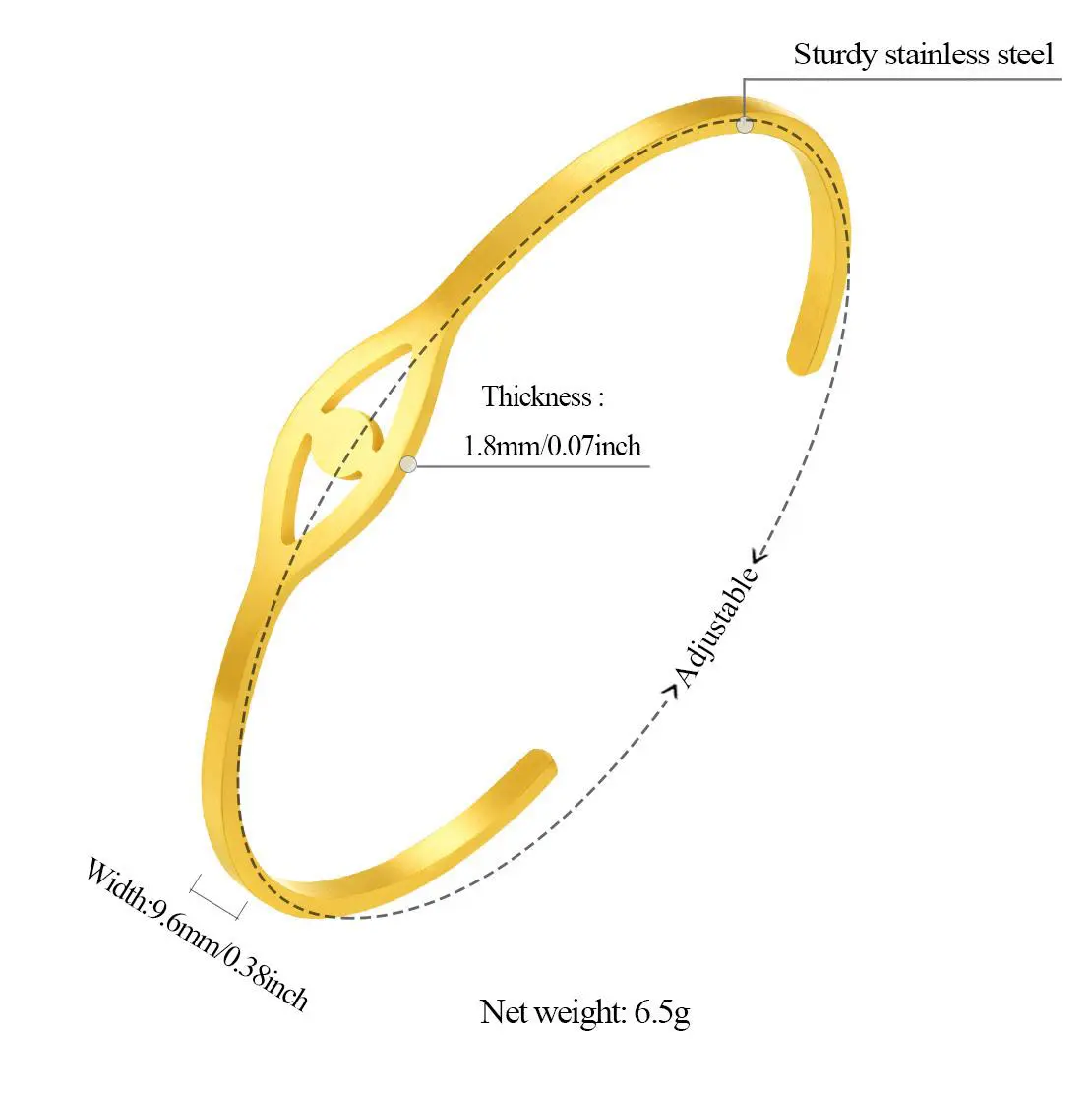 Explore FindChic's Golden Wide Cuff Evil Eye Bracelet: Adjustable and chunky, perfect for women, men, birthdays, weddings, and gifting occasions. A stylish protective accessory.