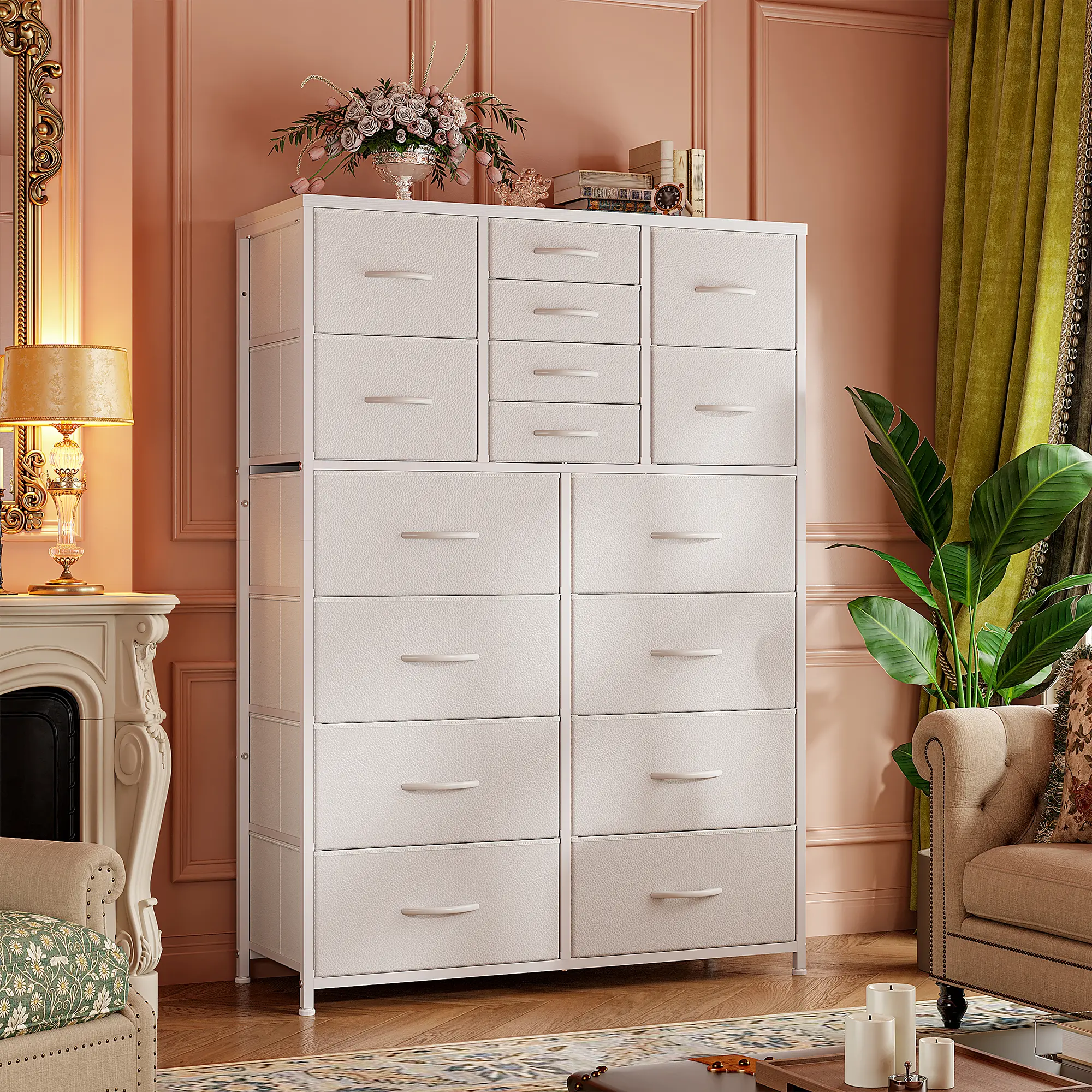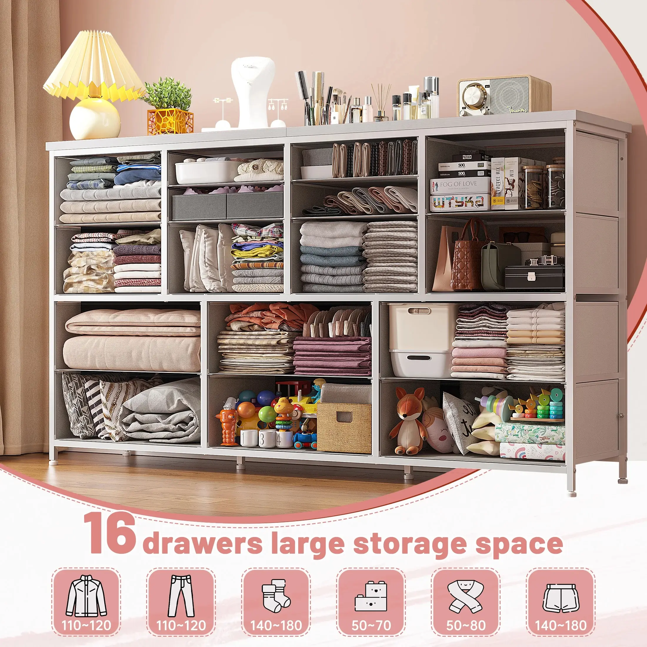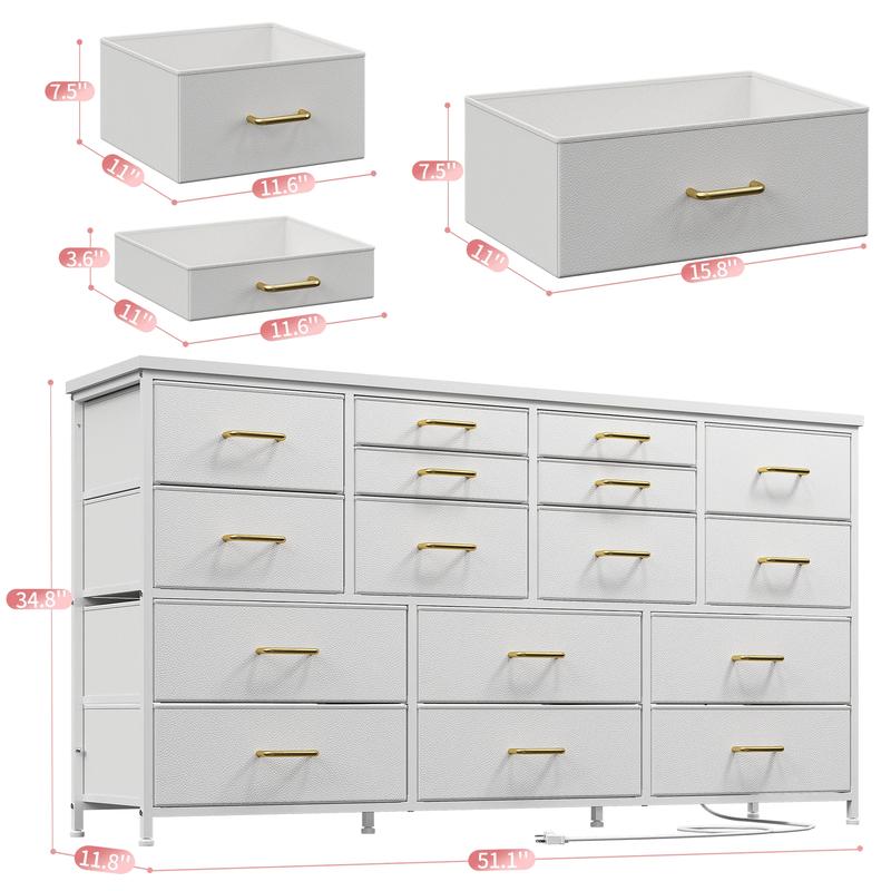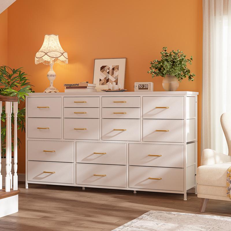 ·【Total load bearing 374 LBS, Solid & Stable】-Our dresser is extremely sturdy with total load bearing 374 LBS and the top panel capable of carrying up to 110 LBS. The 16 drawer dresser has stable and sturdy design that the bottom is equipped with a bearing column. It's safe enough to place art, decoration, TV or daily necessities on the top of the dresser. Practical dresser gives you a convenient life
