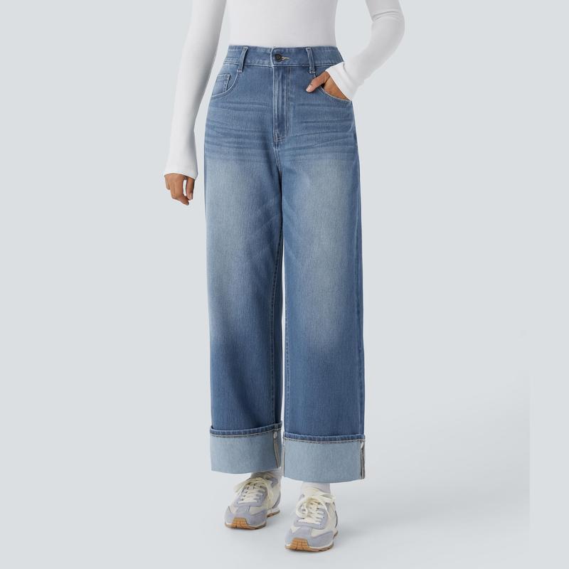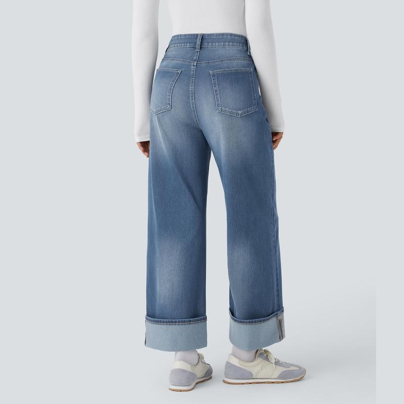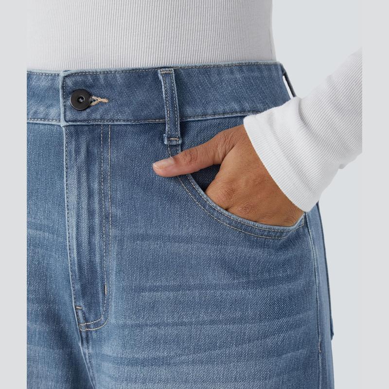 Halara Flex High Waisted Multiple Pockets Adjustable Hem Wide Leg Washed Stretchy Knit Casual Jeans