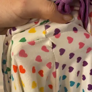 5’4” 117lbs 34D. Small fits perfectly with enough room for comfort. Waistband has a functional drawstring. No pockets on pants. Super cute purple trim and color range of hearts is amazing. Top is long enough to cover backside. Fabric is luxurious, soft, with good weight.