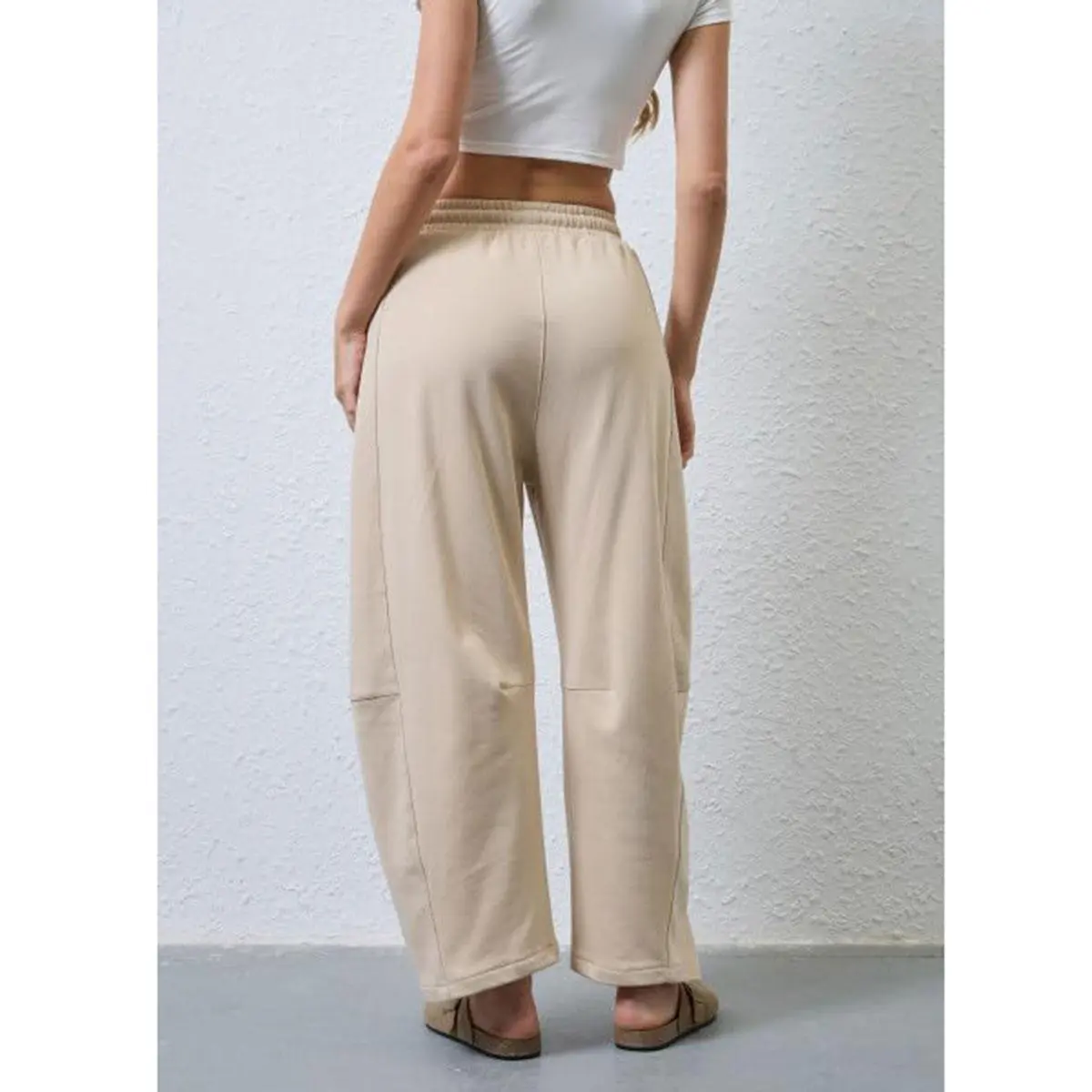 ·Features: Barrel leg pant featuring a mid-rise elasticated waistband, drawstring tie and front pockets, seam detailing at the knees, relaxed fit styles