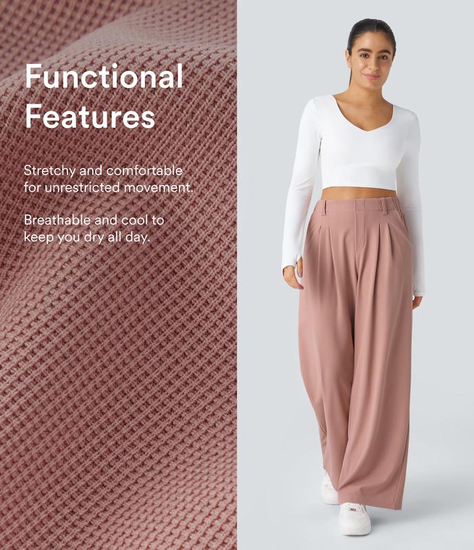 Great fit and true to size! The high waist is flattering, the pleats are stylish, and the waffle gray color matches the photos. Love the functional side pockets!