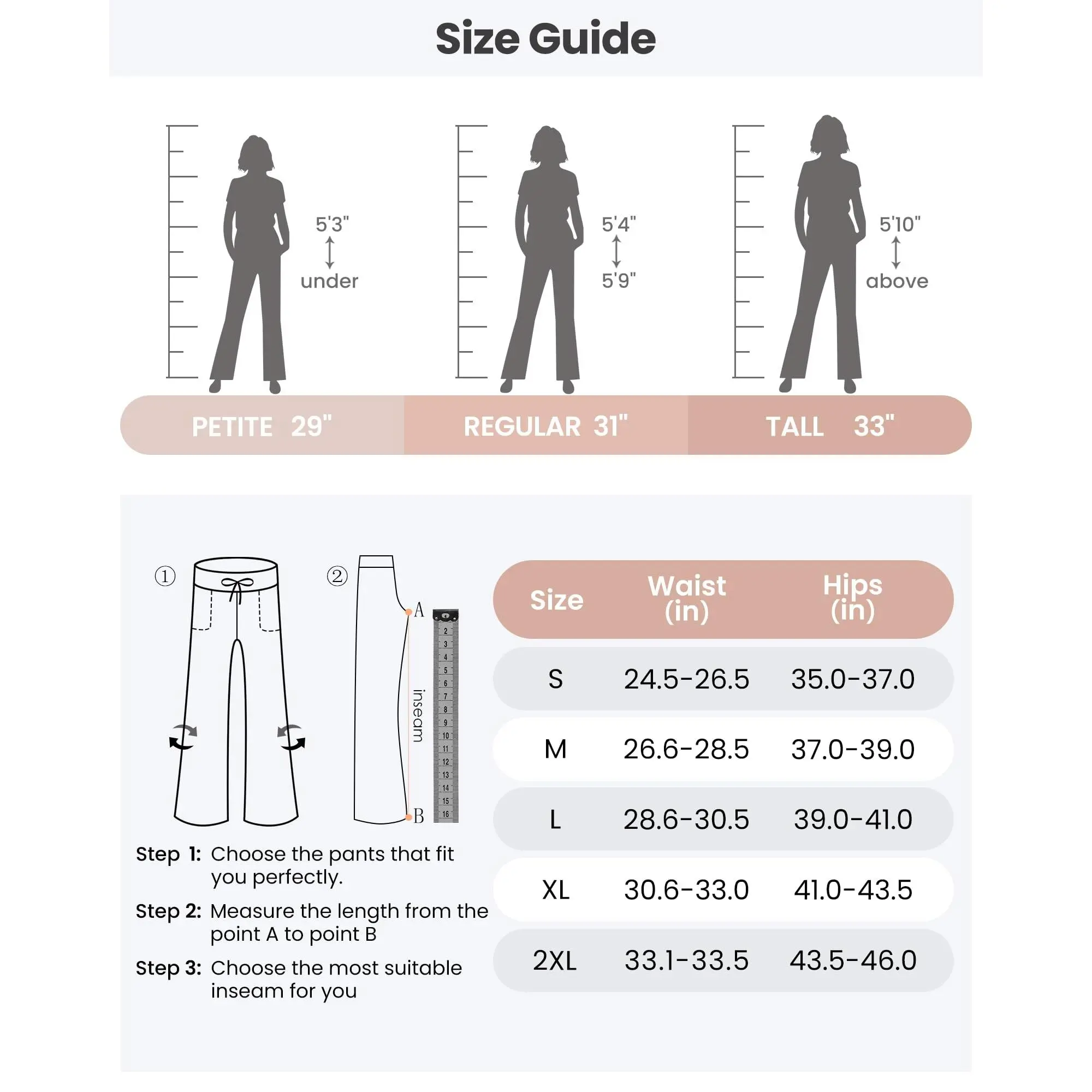 These are the perfect work/lounge pants! The material is so comfortable and they are so flattering to wear! The pockets are perfect and there’s even a tie! I and 5’7 with long legs and I got a M. These are way better quality than my Lululemon pants but way cheaper! Had no problems with pilling!!