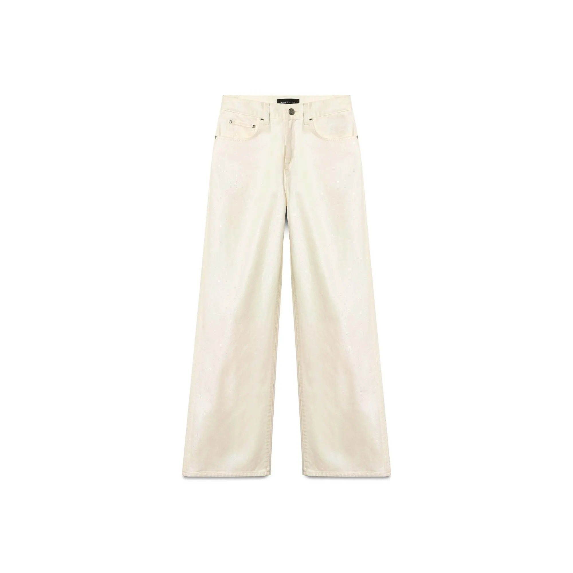 Crafted from premium off-white denim with a pearlized finish, this high-rise is cut with a wide, relaxed leg. It features five pocket styling, reinforced belt loops, bar-tack stitching, chambray lining for a more comfortable fit, a custom Purple cowhide leather patch and signature hangtag branding.