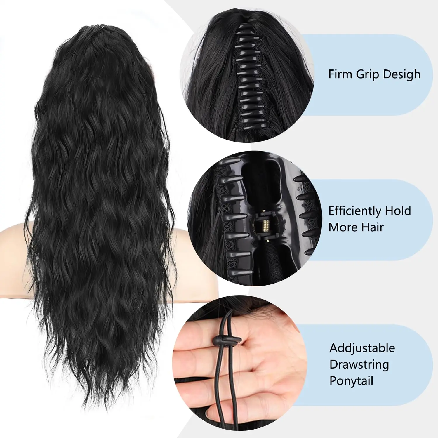 HAIR MATERIAL:Long curly ponytail hair extension is made of premium synthetic fibers which looks like real human hair.Length: 20"; Weight: about 160g.