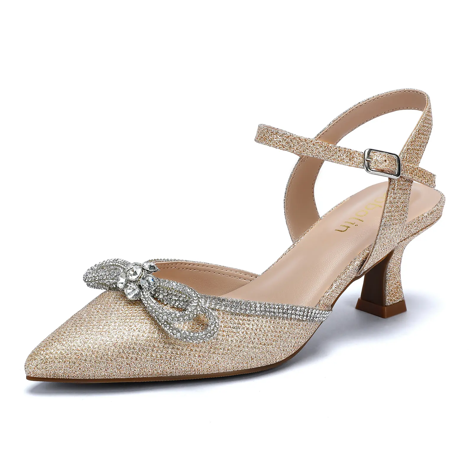 Wide Width Kitten Heels for Women – Rhinestone Bow Pointed Closed Toe Pumps with Ankle Strap for Wedding, Bridal & Party Dress Shoes Fashionable Heeled Sandals Dressy Summer Sandals