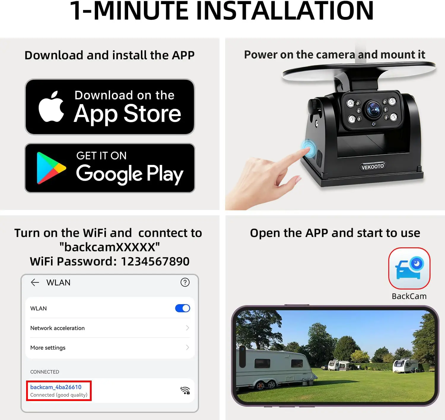 Forget complicated setups! This wireless backup camera offers a simple 3-step process: download the app, connect to WiFi, and view on your device. No drilling or messy wires needed. Perfect for quick, hassle-free installation. 📱