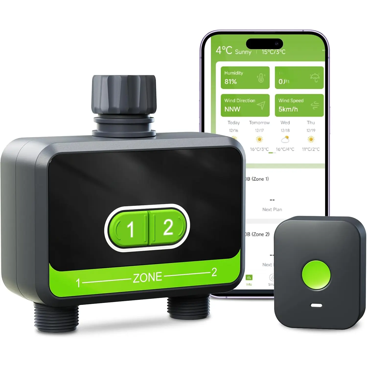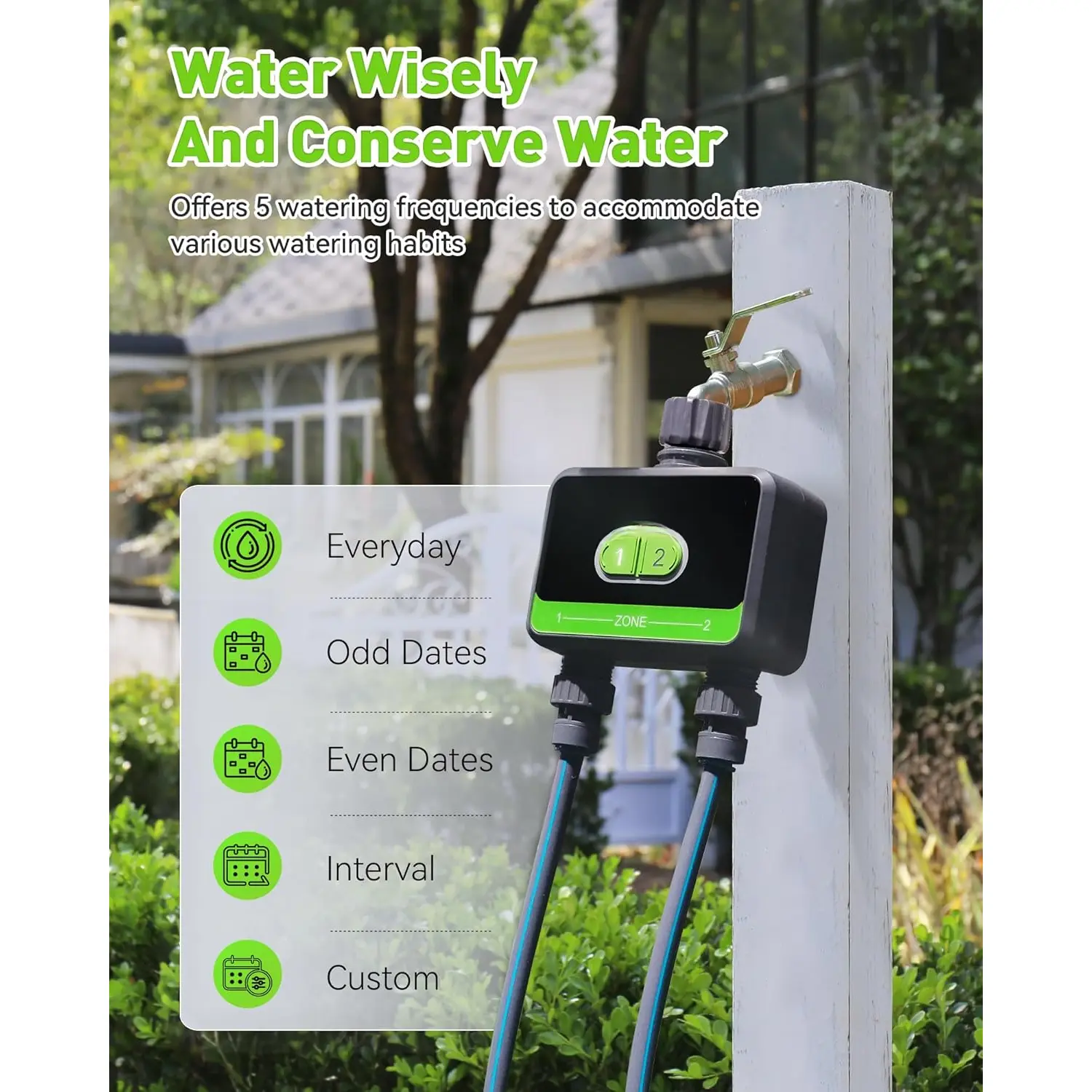 【Dual Programmable Zones】 Each hose timer zone operates independently, allowing for customized watering schedules for each zone. Set up to 6 watering schedules per zone for efficient and intelligent watering.